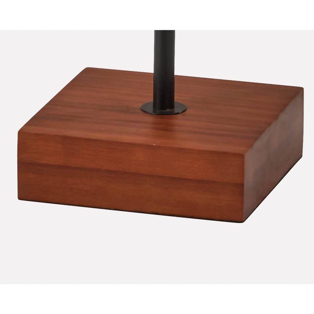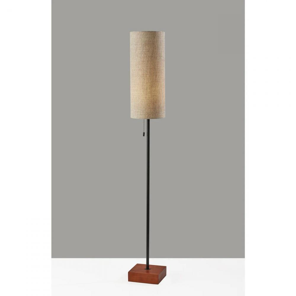 Illuminate your space in a stylish blend of neutral colors with the 62" tall Trudy floor lamp. This modern lamp artfully mixes materials and shapes, with a cube-shaped base in a warm walnut finish, a thin black stem, and tall drum-shaped shade. The beige and brown textured fabric shade softly distills light from the 100W bulb (not included). Operated by a black metal pull chain switch that matches the stem, the table lamp also features a 6' brown cord. The Trudy floor lamp is also available with a blue textured fabric shade or a mustard yellow textured fabric shade.