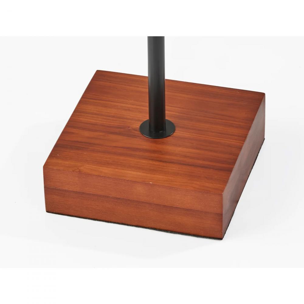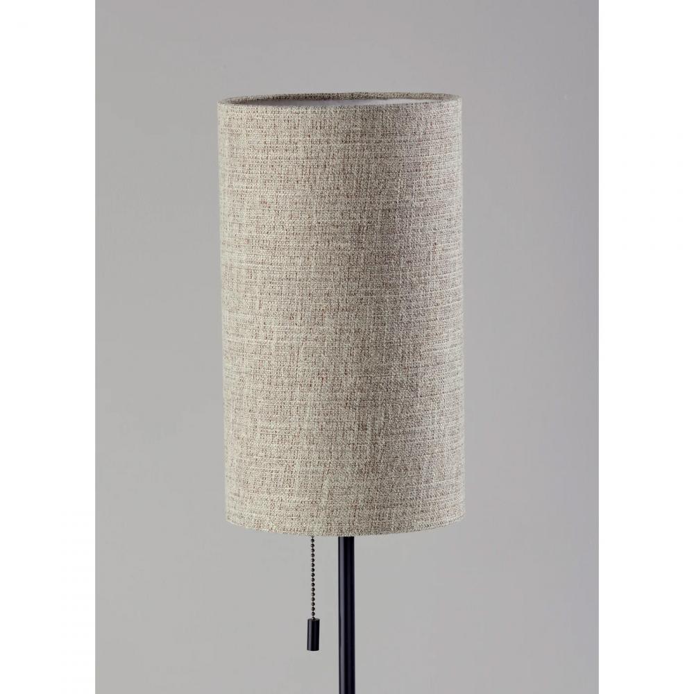 Illuminate your space in a stylish blend of neutral colors with the 26.75" tall Trudy table lamp. This modern lamp artfully mixes materials and shapes, with a cube-shaped base in a warm walnut finish, a thin black stem, and tall drum-shaped shade. The beige and brown textured fabric shade softly distills light from the 60W bulb (not included). Operated by a black metal pull chain switch that matches the stem, the table lamp also features a 5' brown cord. The Trudy table lamp is also available with a blue textured fabric shade or a mustard yellow textured fabric shade.