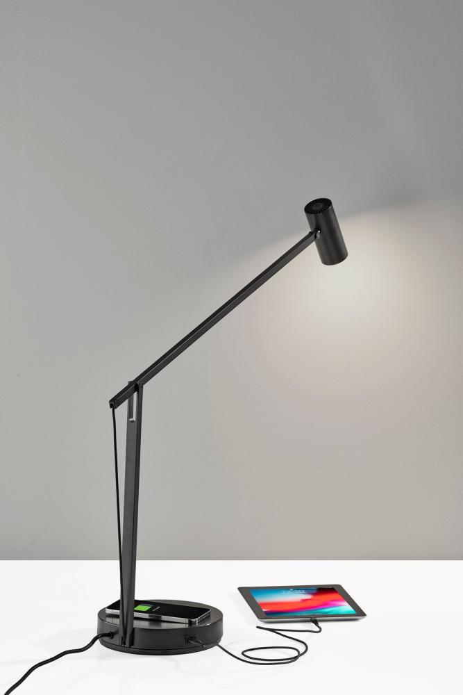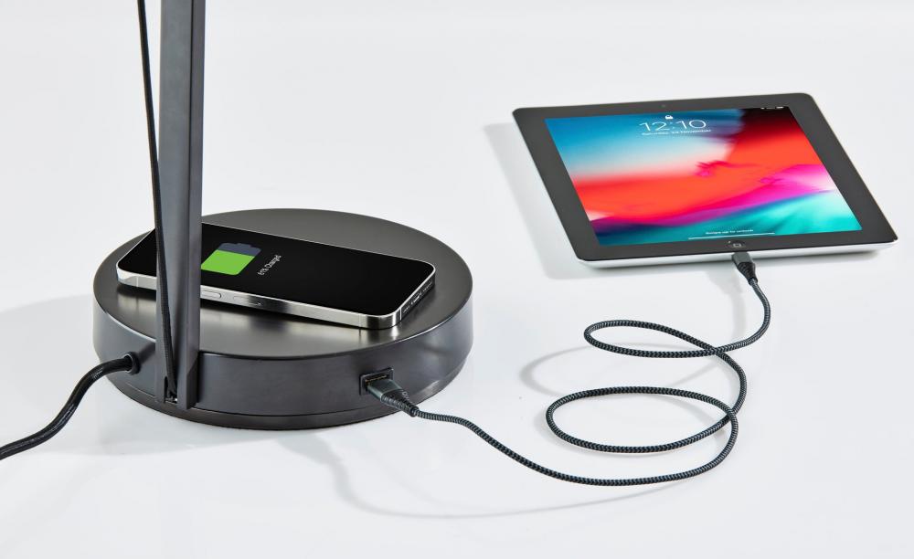 A flexible task light, the Crane LED desk lamp has a long arm that is easy to adjust in height and rotation. A bronze finish, accented with a black fabric cord communicates a polished, contemporary look. The Crane makes use of its black cloth covered cord and a special spring hidden in the base to balance its arm at any angle you choose to pose it. A small but powerful cylinder shade holds an energy-efficient 7 Watt LED lthat is replaceable. The simple 4-way touch dimmer switch is located at the end of the shade. For added functionality, the base of the lamp houses an integrated Qi-certified charging pad, supporting 5W charging on contact to get your phone from 0% to 100% in just 3-4 hours. A USB port is also located on the side of the base for charging a second device simultaneously.