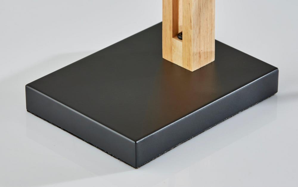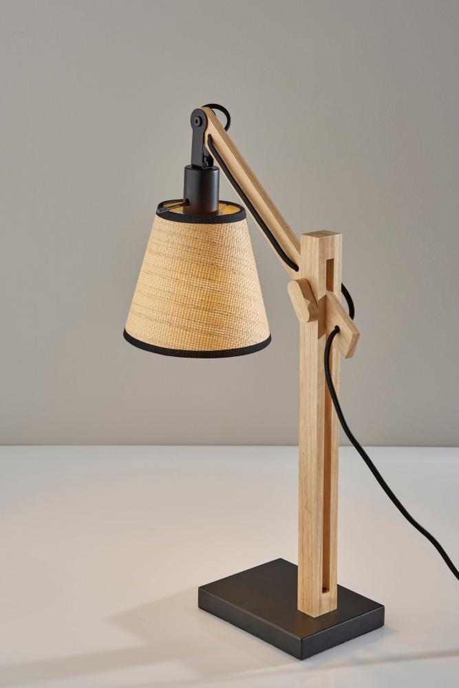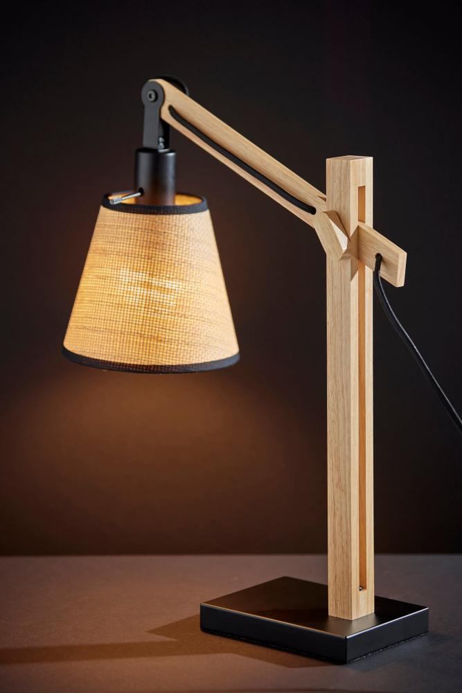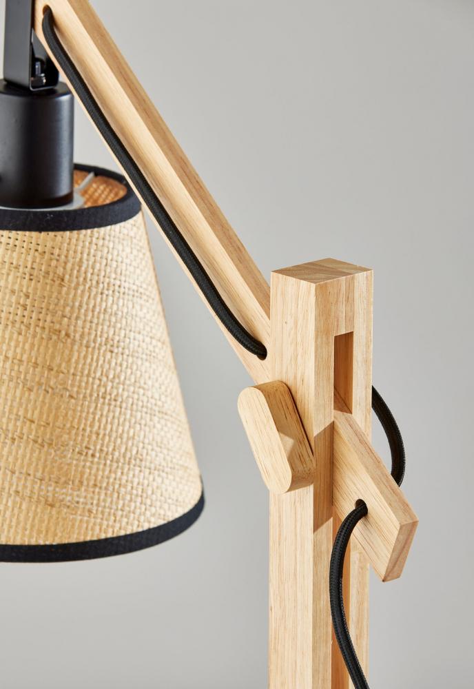 Introduce the Walden table lamp into rustic, contemporary, or eclectic spaces. Wooden joints adjust the balance arm to change the lamp height and angle of the shade, making the lamp ideal for both task lighting and ambient lighting. The black metal base and accents enhance an industrial style, while the natural wood body and natural woven paper shade with black trim along the top and bottom soften the look. For a unique style, the black fabric-covered cord threads through the square wood post body and drapes out the back, while the 60W bulb is easily turned on and off by a discreet rotary socket switch. The Walden table lamp is also available with a black wood construction for a monochrome look. Complete your decor with the coordinating Walden floor lamp.