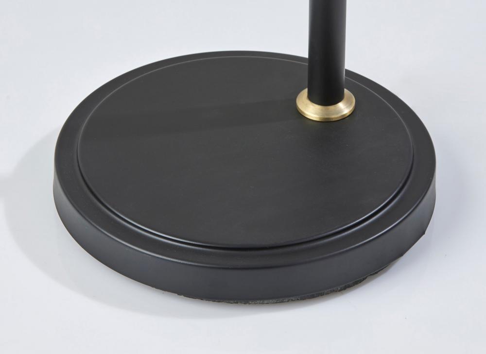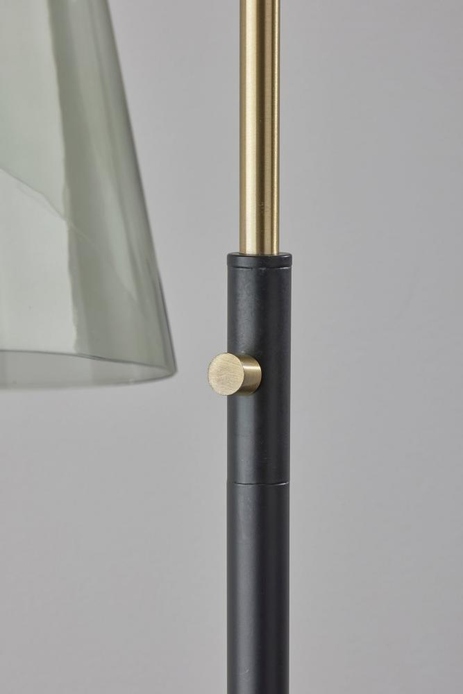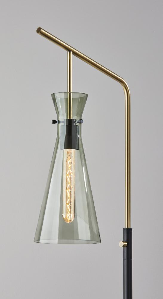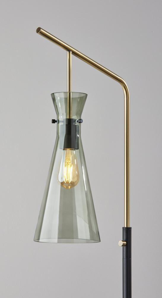 The Walker floor lamp embraces the mixed metal trend with its stunning and eye catching design. A round, black metal base supports a tall, slim black tube and antique brass arm. The arm is designed with a softened bend to support the elegant glass shade. Crafted of smoked glass, this tapered conical shade leaves the black metal socket and included 40W Edison tube bulb visible for striking, vintage appeal. The lamp is easily turned on or off with a rotary switch in antique brass finish located on the tube. Complete your decor with the coordinating Walker desk lamp, wall lamp, and pendant lighting.