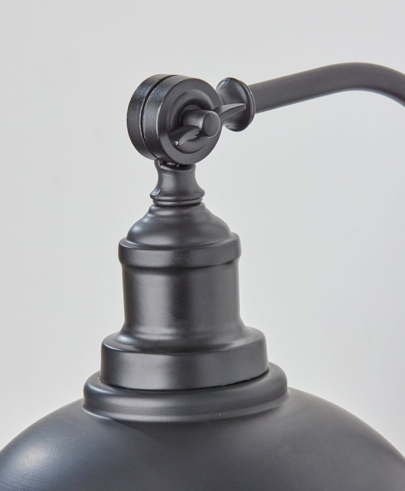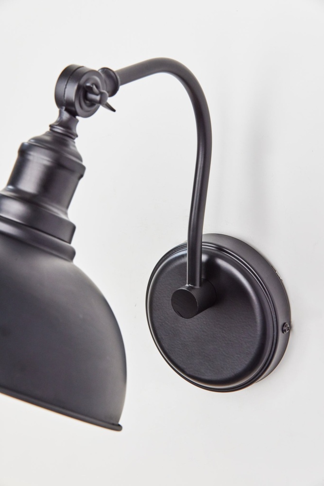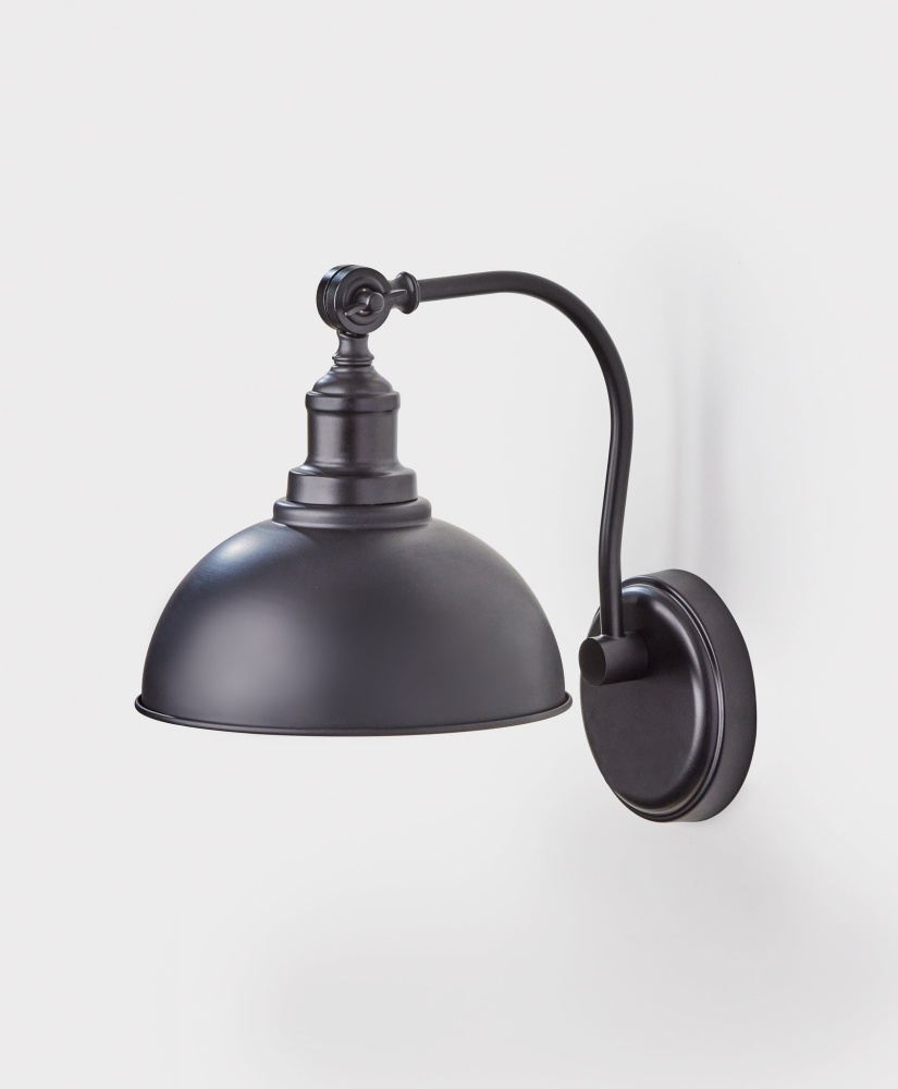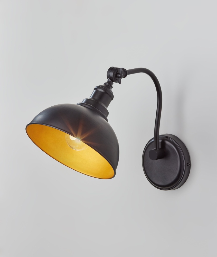 With its clean style lines and monochromatic metal construction, the Wallace wall lamp is a perfect complement to industrial decor. For symmetrical design, pair two of these sconces on either side of beds, fireplaces, or mirrors or place individually in entryways or other spaces for a pop of light. The large round black metal shade has a clean silhouette that leaves the bulb exposed, making a vintage Edison bulb (not included) an eye-catching choice. Complementing the exterior's black metal, the interior of the shade features an accent color of gold finish that imbues the light from a 60W bulb with a warm glow. The base of the lampshade also features an articulation point, allowing you to direct the light wherever it's needed. Complete your decor with the coordinating Wallace pendant light, desk lamp, and floor lamp.