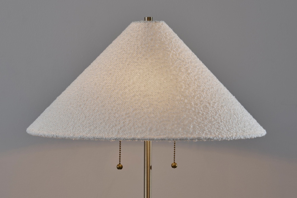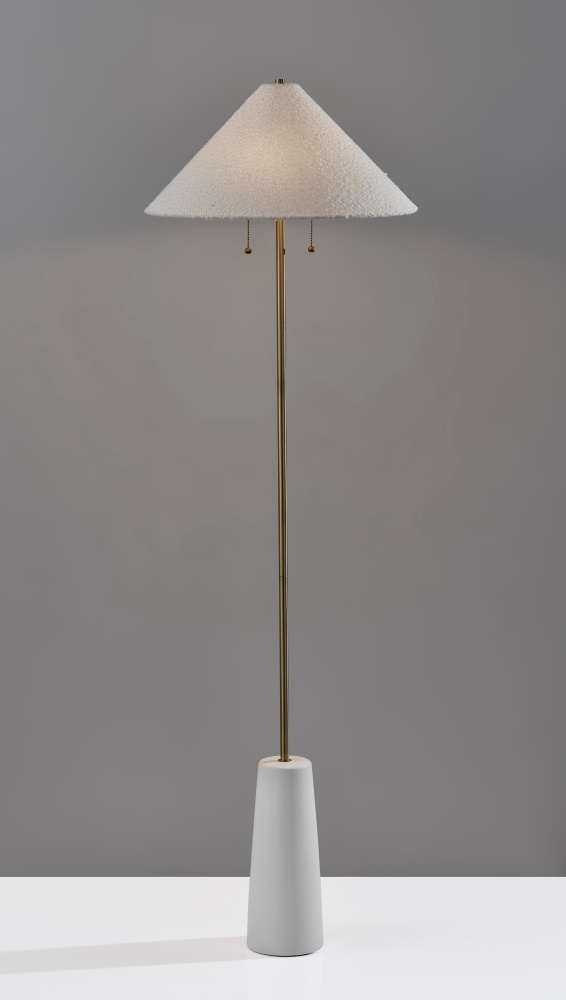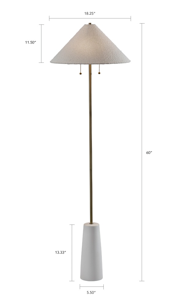 Introducing the 3246-02 Waylon Floor Lamp, a stylish fusion of modern elegance and timeless design. This lamp features a sleek white ceramic base complemented by an antique brass metal pole for a touch of vintage charm. The white boucle fabric shade adds texture and softness, casting a warm and inviting glow in any space. Standing tall at 60 inches, the Waylon Floor Lamp is perfect for brightening up living rooms, bedrooms, or offices. Equipped with on/off double pull chain switches, this lamp combines practicality with an eye-catching aesthetic.
