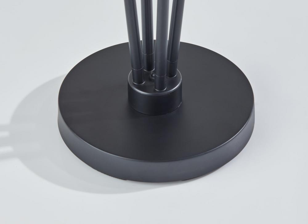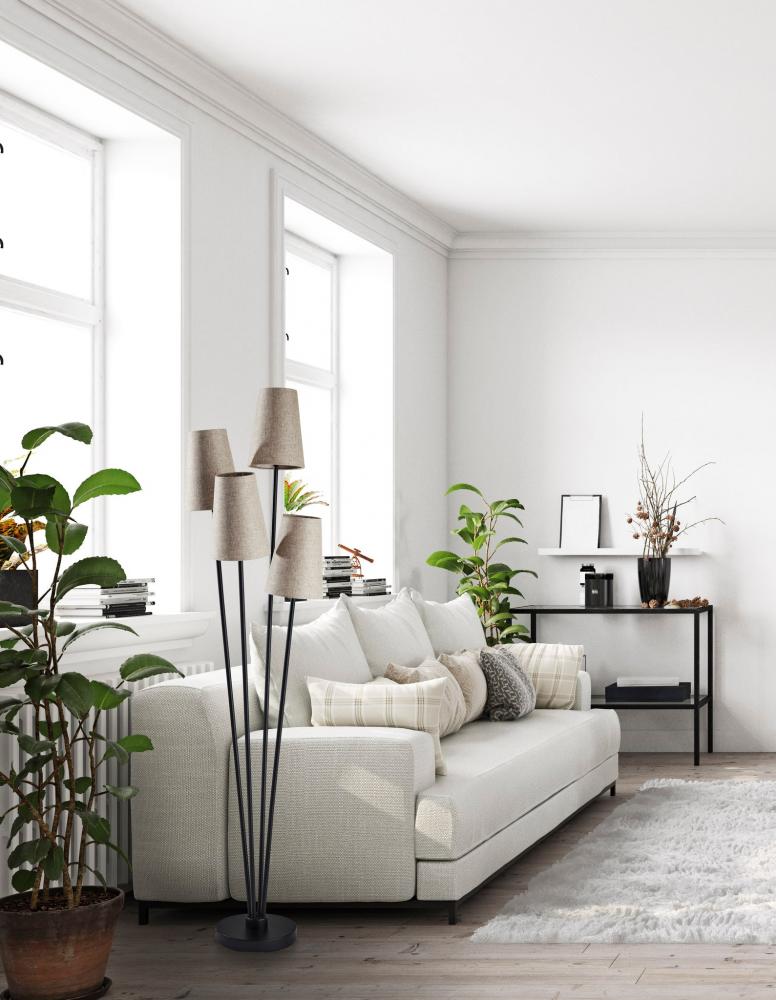 Four is better than one! The Wentworth floor lamp's modern, asymmetrical four-arm silhouette blends contemporary design with classic materials to illuminate your space in style. The lamp features a simple, 10" diameter round base in black metal finish supporting four matching thin stems that gradually fan out from the base. Topping the stems at varying heights are four beige textured linen shades to throw a soft glow from 40W bulbs. Powered by a 5' black cord, the lamp is easily turned on or off with a foot step switch. The Wentworth floor lamp is also available with an antique brass finish and off-white textured fabric lampshades to complement mid-century modern decor.