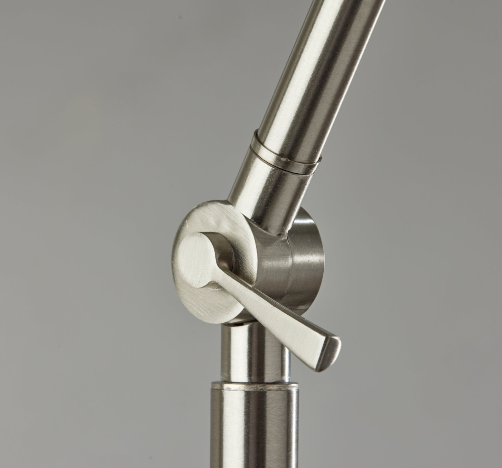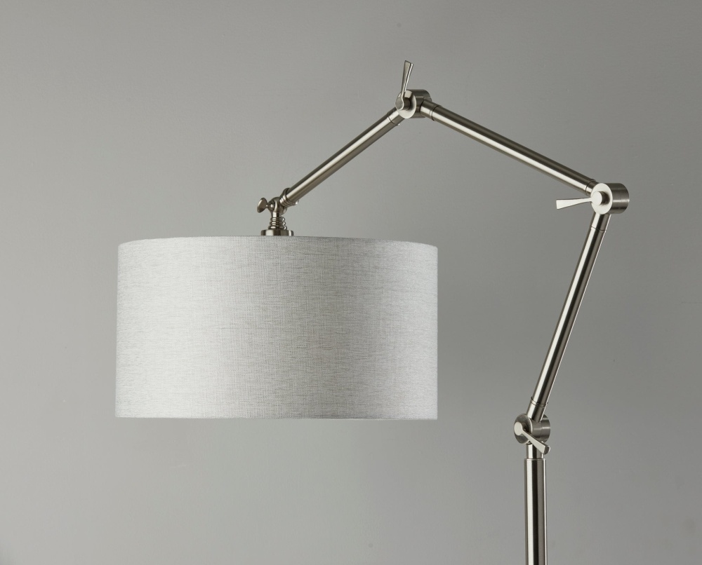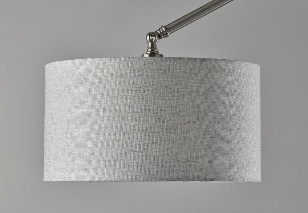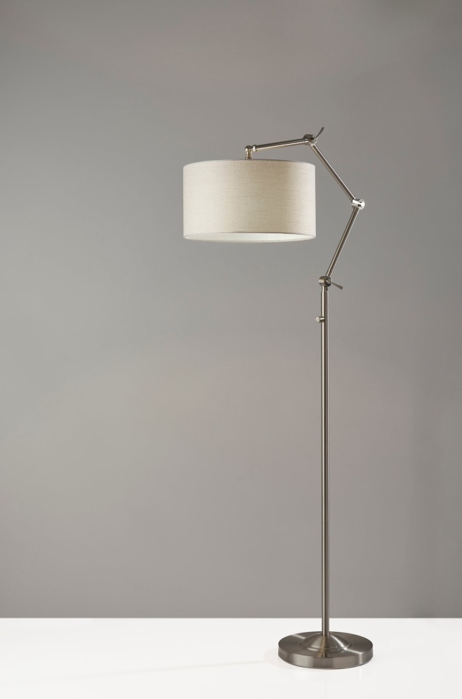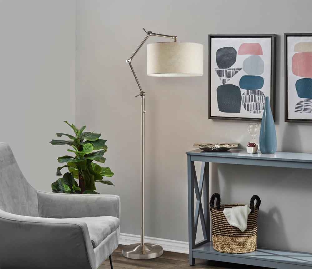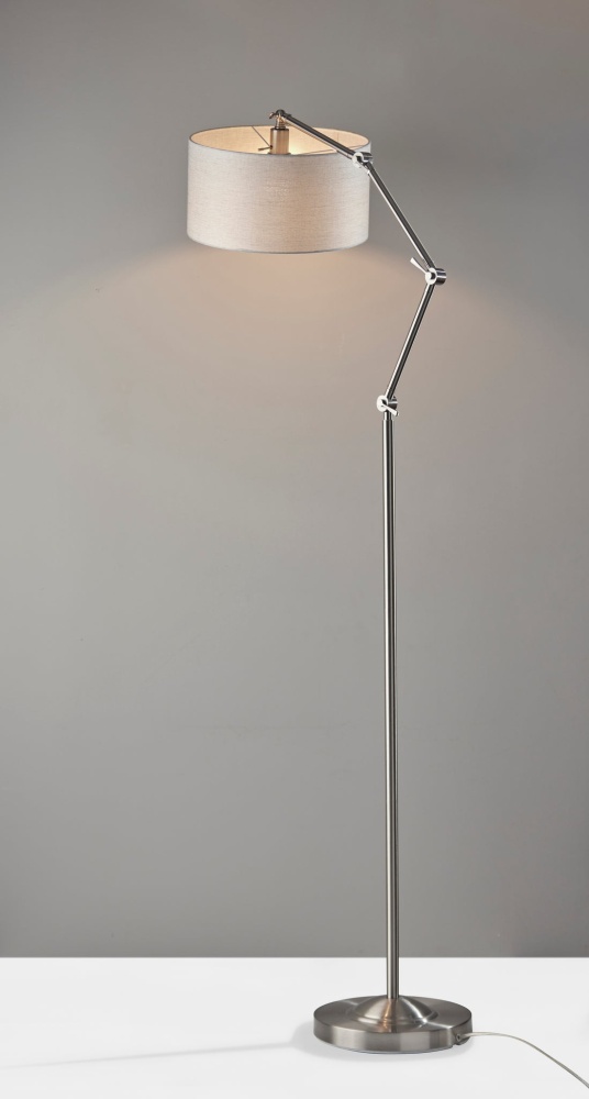 The Willard lamp puts a contemporary spin on the classic floor lamp design. With four articulation points along the long, thin stem, the height and angle of the lamp can be adjusted in any number of ways, allowing you to shape the lamp to suit the needs of your room. Depending on how the stem is adjusted, the lamp height ranges from 64" to 77". Designed with a stylish steel finish that complements any decor, the lamp features a round 12.6" diameter base for stability supporting the long stem. Topping the lamp is a light grey textured fabric drum shade to softly disperse light from a 100W bulb (not included). Operated by a high/low rotary switch on the pole, the lighting can easily be changed between high, low, and off. Do NOT use 3-way bulbs. If using LED bulbs, use dimmable. However, we recommend incandescent bulbs for best results on both brightness settings. The Willard floor lamp is also available in a bronze or steel finish.