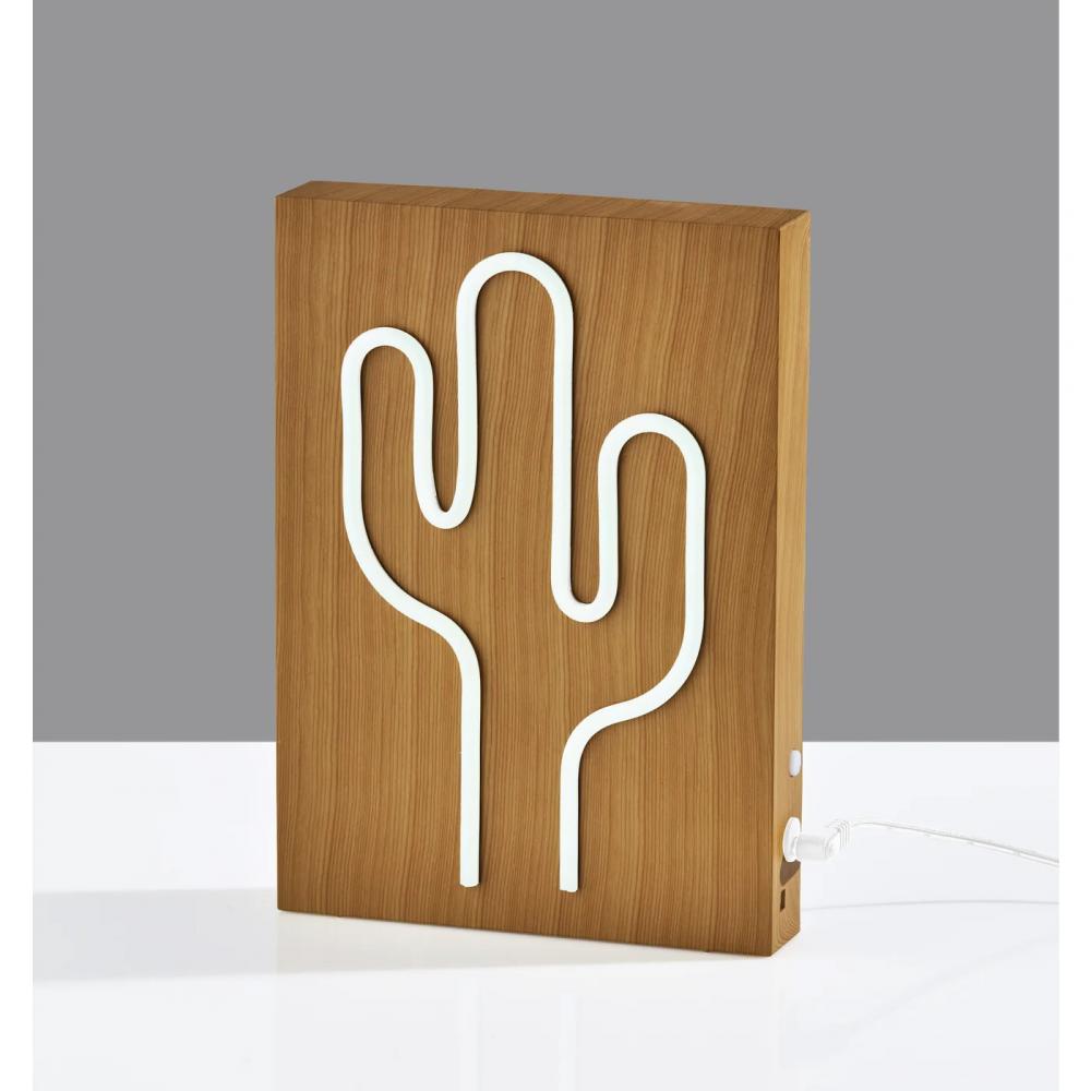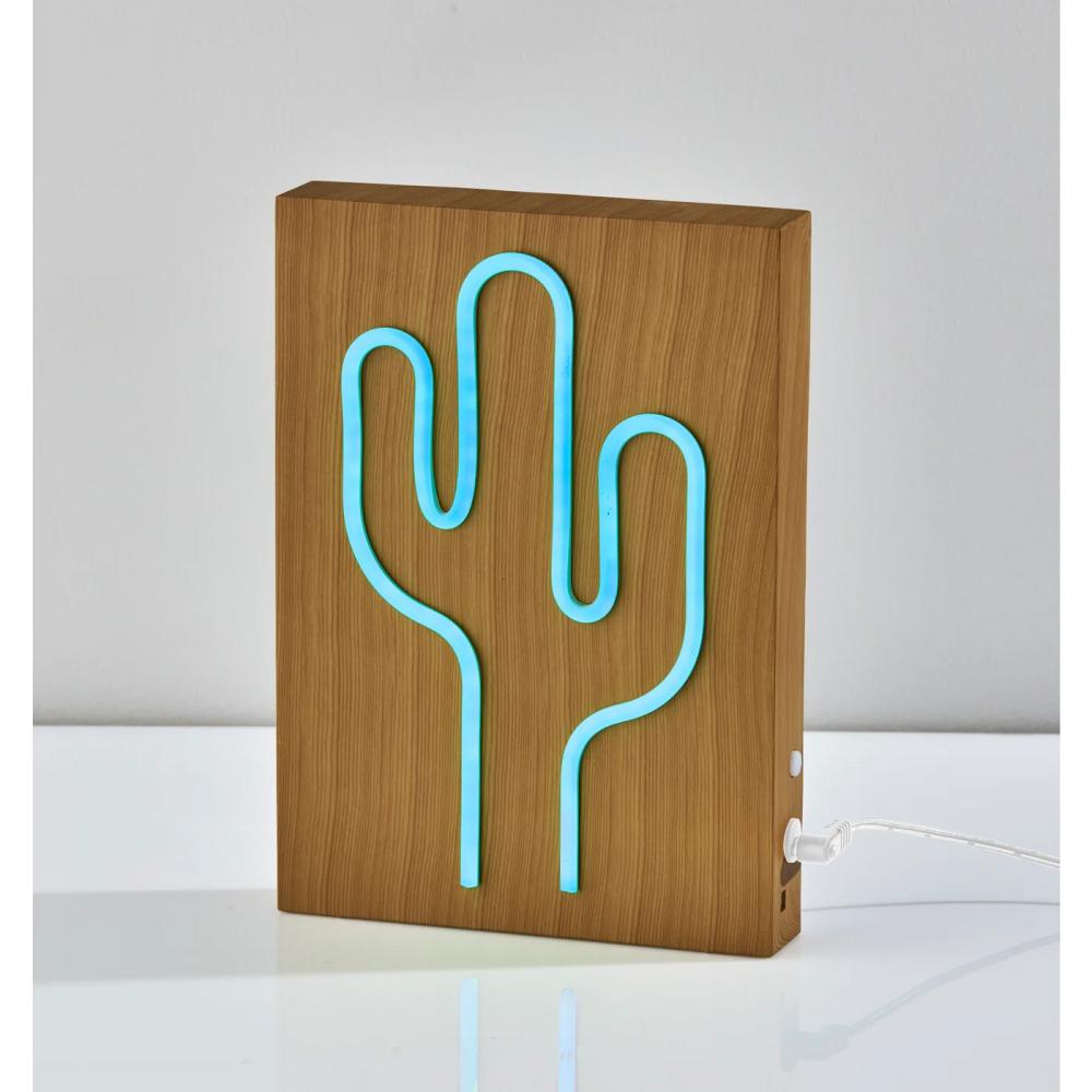 It's all about southwest vibes with this bold Simplee Adesso neon cactus light that brings a retro feel with a modern twist to any space. It features an outline of a cactus in neon light set against a plastic base with a natural wood grain finish. The base houses three "AA" batteries (not included), making it easy to add a fun and stylish glow to any table, desk, or shelf without the mess of a cord. You can alternatively power the light with the included 8' USB cable for unlimited use without needing to worry about replacing batteries. For added versatility, the light comes with a mounting hole located on the back of the base for mounting to a wall, creating contemporary wall art. This 9" high and 6.5" wide piece includes a 0.5W color-changing LED light, alternating between blue, green, white, pink, and yellow, operated by a push button switch. Even with the light powered off, the stylish cactus detail creates an eye-catching retro look.