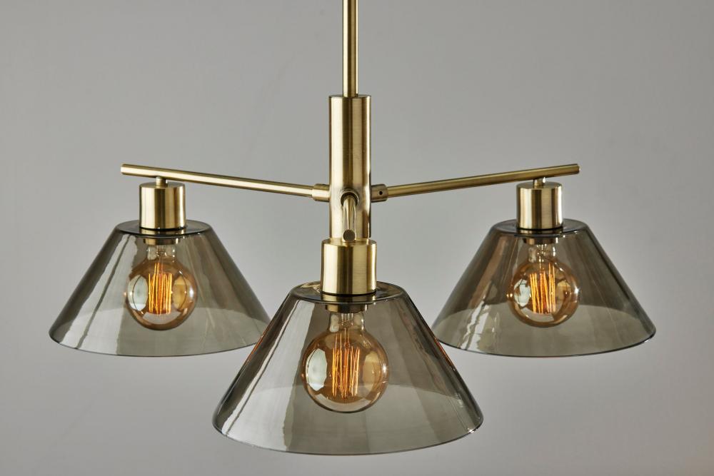 Brighten your space in stunning vintage style with the Zoe 3-light chandelier. Thanks to its innovative design, this chandelier is the perfect addition to any space regardless of ceiling height or style. With an adjustable stem connecting the lamp fixture to the round canopy, the height of the chandelier can be modified between 22" and 37" to accommodate various ceiling heights. For use on vaulted or sloped ceilings, the stem also features an articulation point so the fixture always hangs level. Antique brass dominates this piece, from the 5" diameter round base to the narrow stem and branching arms. Crafted of smoked glass, the three inverted cone-shaped shades leave the 40W bulbs visible. For a distinctive vintage look, Edison bulbs (not included) are recommended. Complete your decor with the Zoe desk lamp, floor lamp, wall lamp, and pendant lamp.