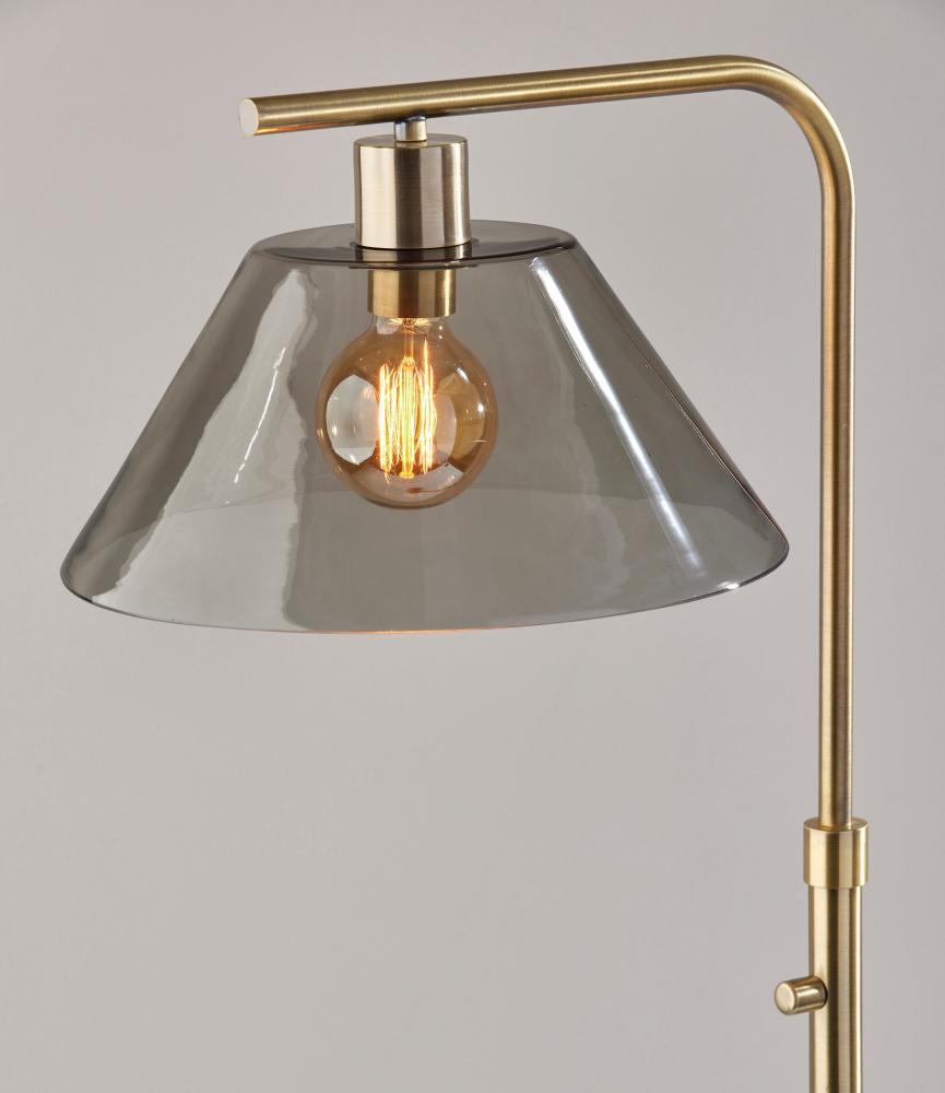 Brighten your space in stunning vintage style with the Zoe floor lamp. An antique brass finish dominates this piece, from the 10" diameter round base to the slender curving stem and arm. Suspended from the arm is an inverted cone-shaped smoked glass shade that leaves the 60W bulb visible. For a distinctive vintage look, an Edison bulb (not included) is recommended. The lamp is easily operated by a rotary switch discreetly located on the stem. Complete your decor with the Zoe desk lamp, wall lamp, pendant light, and 3-light chandelier.