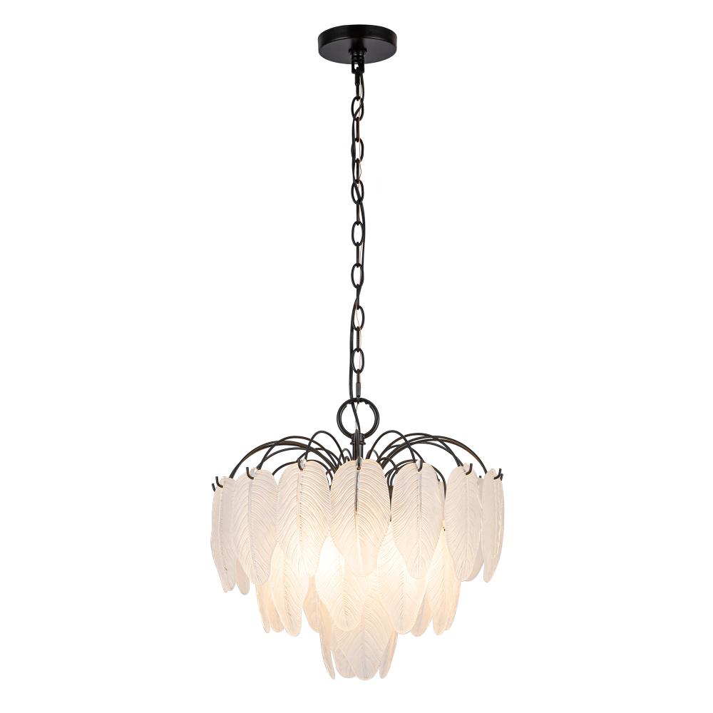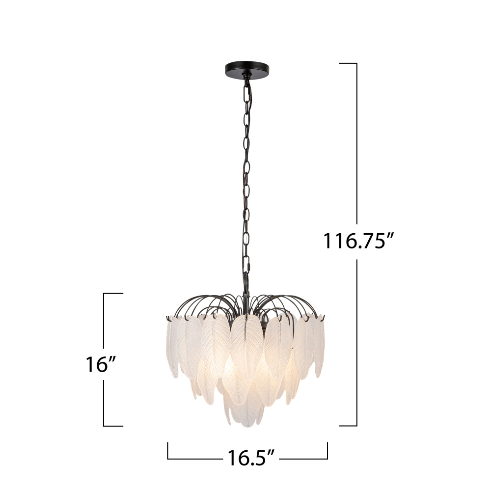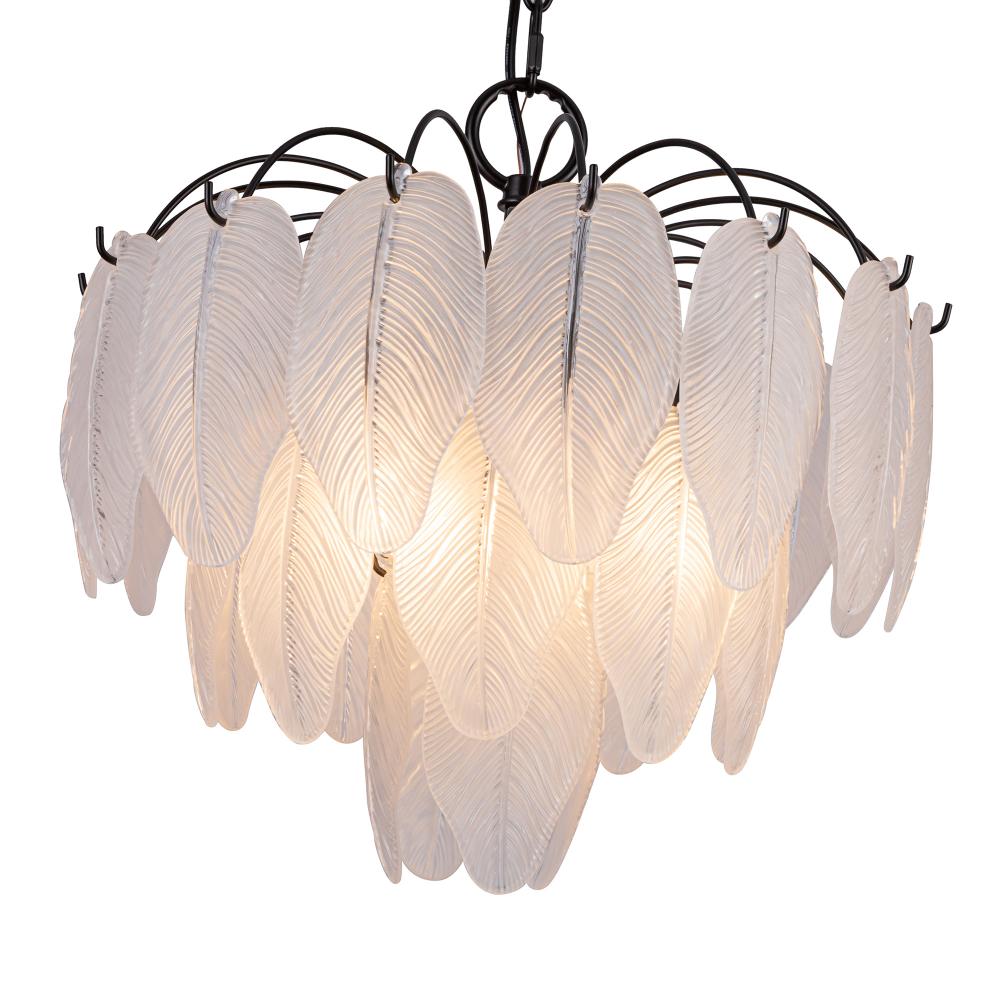 The Alessia Collection chandelier is a captivating blend of modern elegance and nature-inspired artistry. Its bold black frame cradles cascading glass leaves, each etched with organic, lifelike details that evoke a serene forest canopy. With its enchanting glow, this chandelier helps transforms any space. (16.5 inch diameter model)