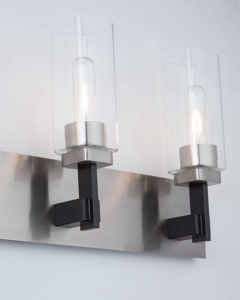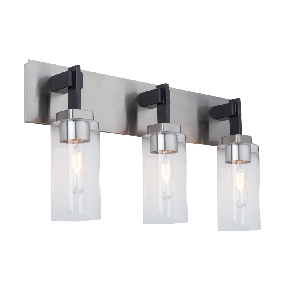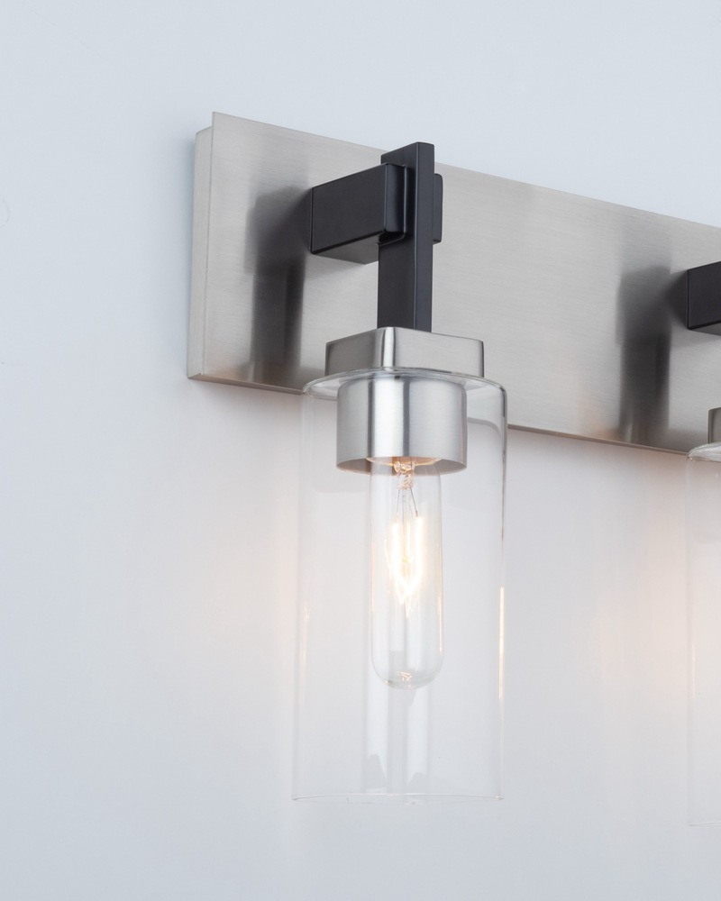 The Arlington collection features clear rectangular glassware that adds a touch of refinement to any bathroom and/or vanity. Its dual-tone black and satin nickel frame provides a modern aesthetic. This collection seamlessly blends style and functionality, making it a stylish choice for those seeking a contemporary and refined bathroom decor. 3 light wall sconce shown. (Also available in a single and 4 light versions.)