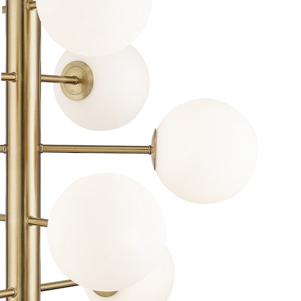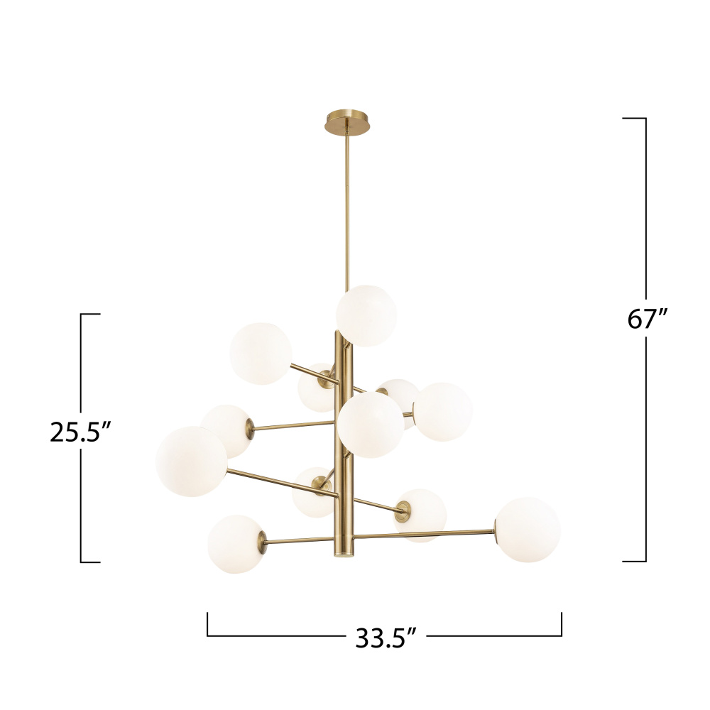 The Aurelia Collection is defined by its contemporary allure, featuring a warm brushed brass frame. Each arm of the chandelier is adorned with beautiful spherical white glassware, creating a visually striking contrast and emitting a soft, inviting illumination. This collection seamlessly marries sleek design with a warm aesthetic, making it a stylish and captivating addition to any space. 12 light chandelier shown. (height adjustable via extra rods included)