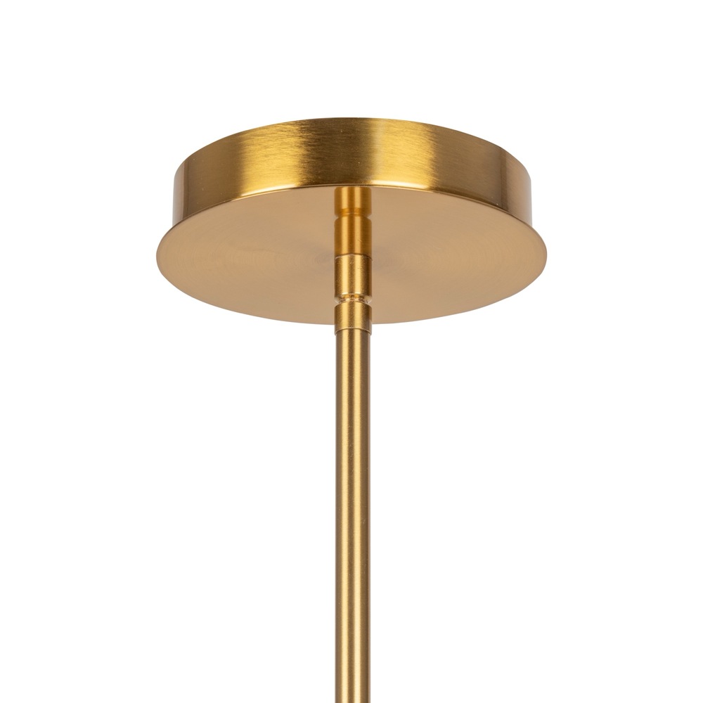 The Aurelia Collection is defined by its contemporary allure, featuring a warm brushed brass frame. Each arm of the chandelier is adorned with beautiful spherical white glassware, creating a visually striking contrast and emitting a soft, inviting illumination. This collection seamlessly marries sleek design with a warm aesthetic, making it a stylish and captivating addition to any space. 6 light chandelier shown. (height adjustable via extra rods included)