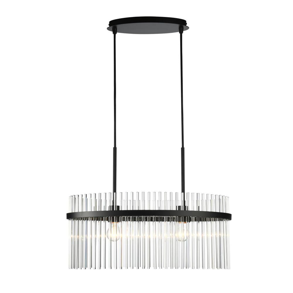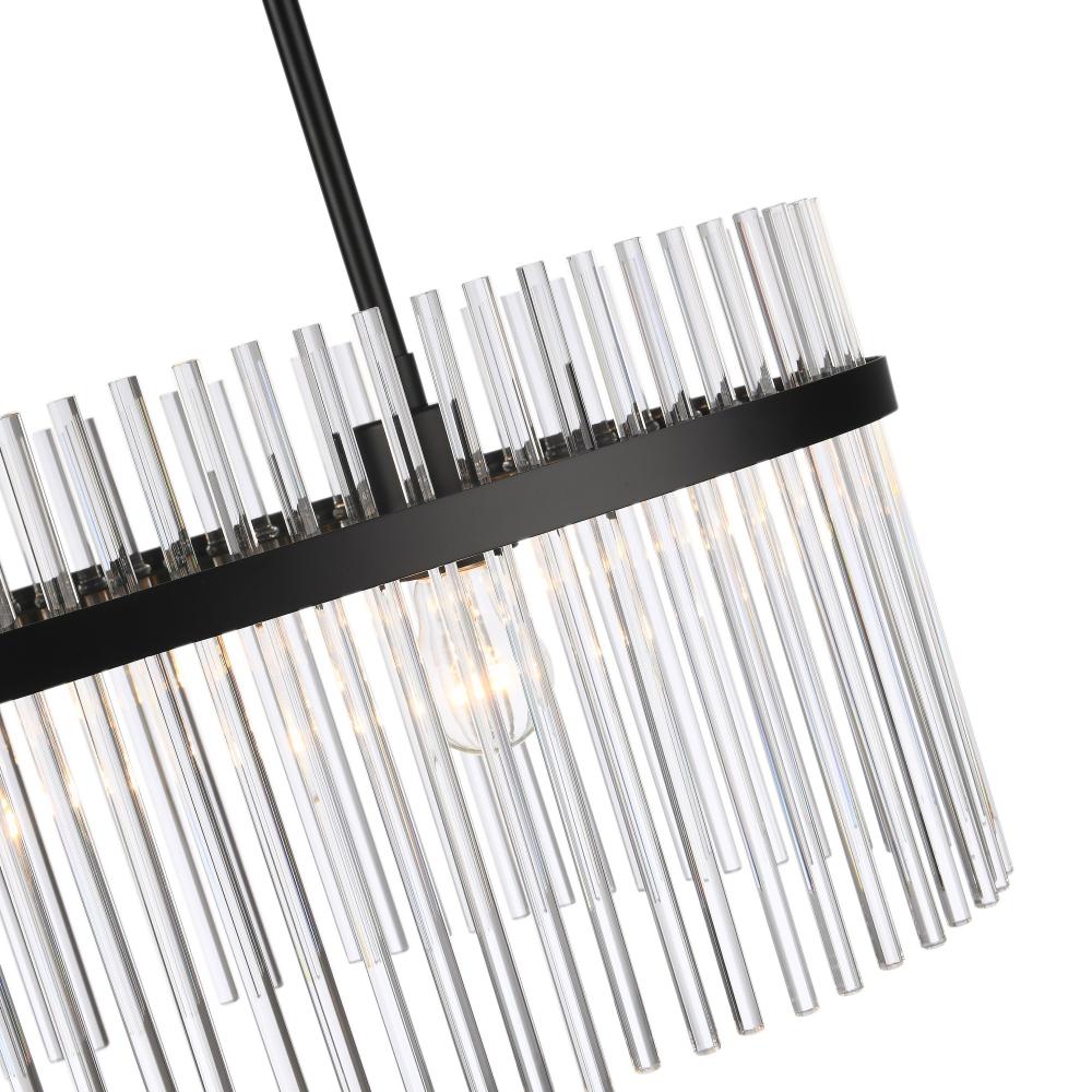 The Ava Collection oval chandelier enchants with its delicate arrangement of circular glass rods, elegantly suspended on a sleek black frame. Its versatile design harmonizes beautifully with both circular and rectangular tables, adding a touch of refined glamour to any room. (This model is easily height adjustable to meet you preference)