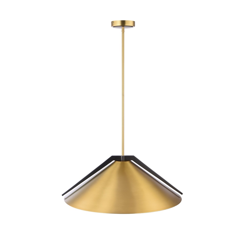 The Baltic Collection is a chic lighting fixture showcasing a metal shade that exudes contemporary style. With a sleek brushed brass finish and tasteful black accents, this pendant adds a touch of modern to any table, island or bar. Its minimalist design and contrasting colors make it a versatile and eye-catching addition. 24" diameter pendant shown (also available in a 15" diameter). (Comes with extra rods for easy height adjustment)