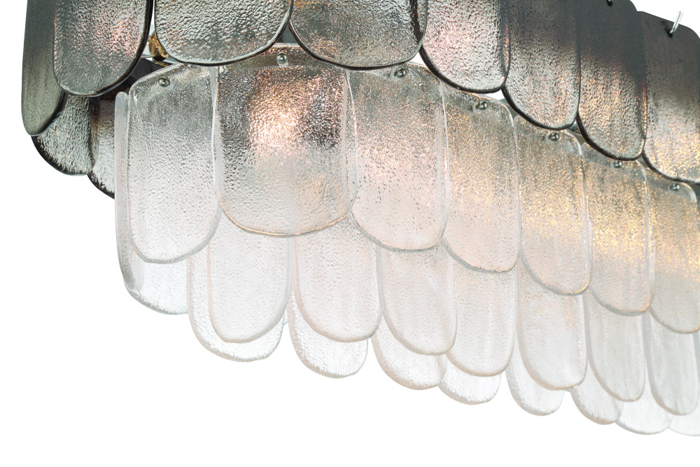 The linear island type chandelier from the Bianca collection exudes elegance with its cascading clear “Piastra” glass panels that shimmer like delicate ice sculptures. (The top row of glass features smoke panels with the balance of the frame has clear glassware). These textured glass elements are gracefully suspended from a polished nickel frame, radiating a sense of refined artistry and grace. A perfect addition to any dining room with rectangular table or perhaps in a kitchen over an island.