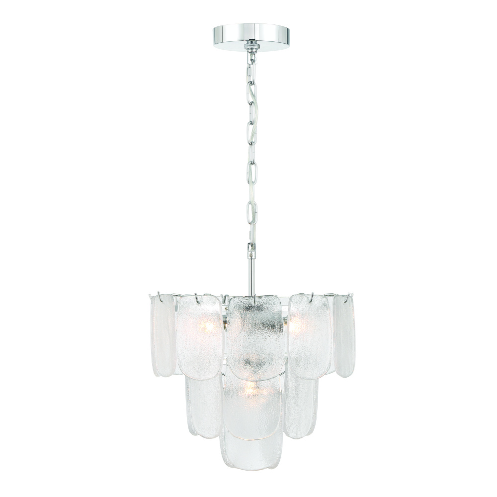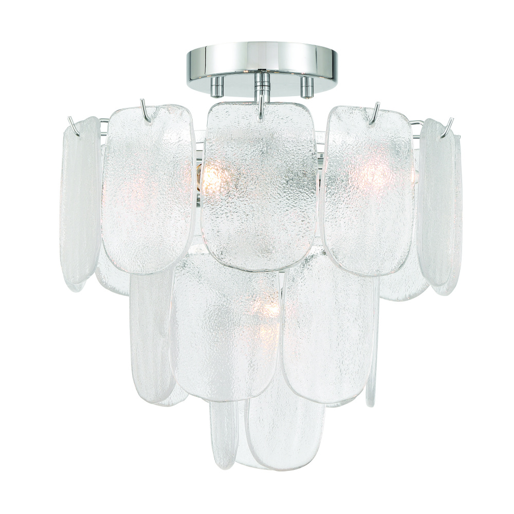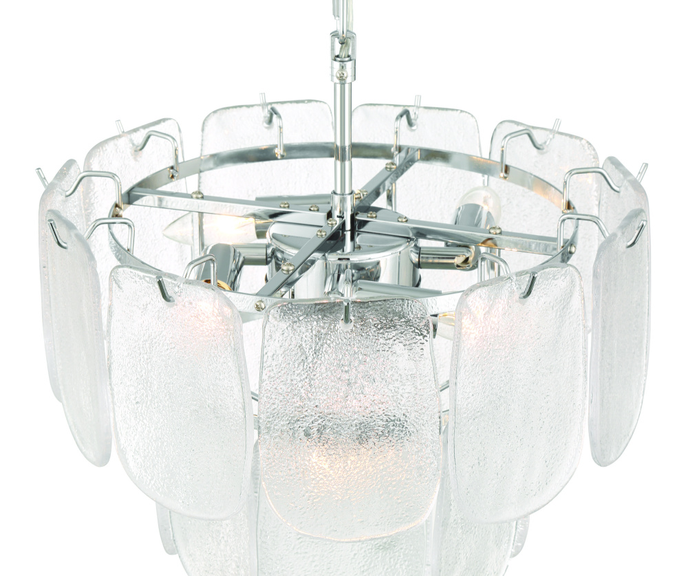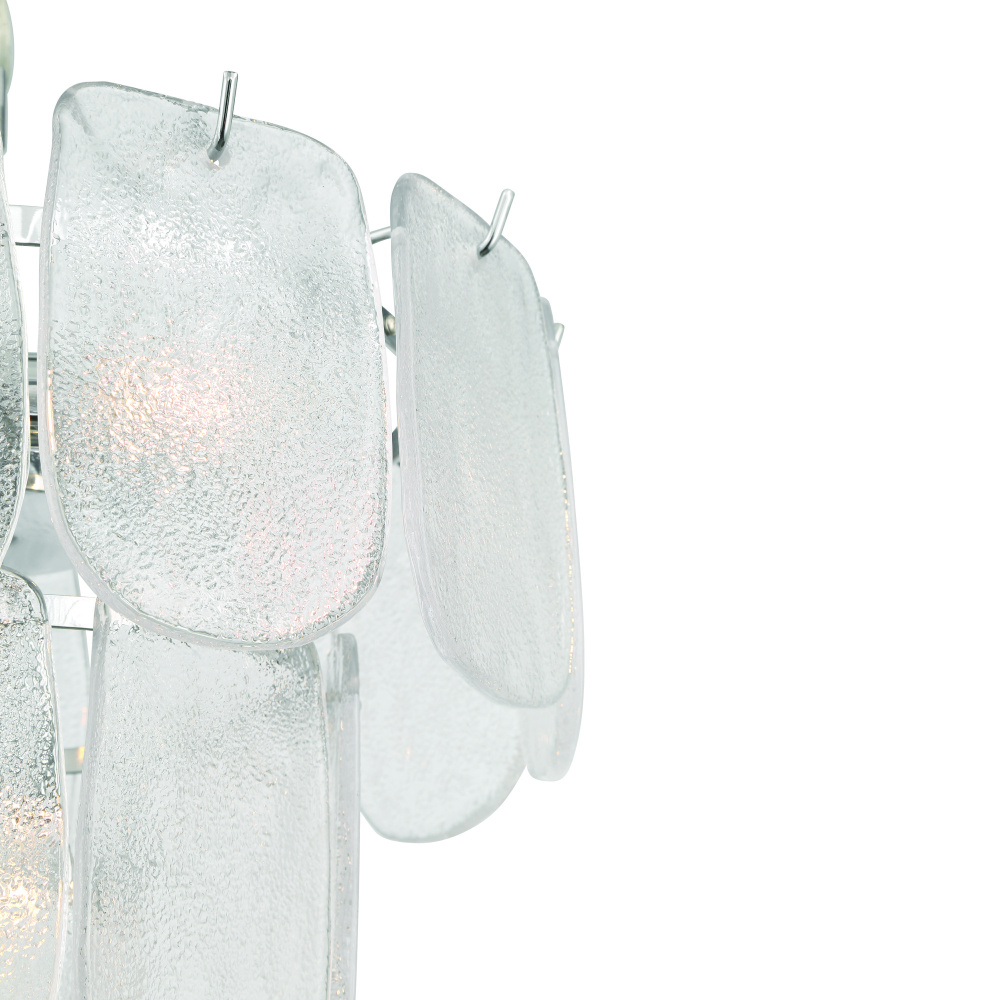 The chandelier from the Bianca collection exudes elegance with its cascading clear “Piastra” glass panels that shimmer like delicate ice sculptures. These textured glass elements are gracefully suspended from a polished nickel frame, radiating a sense of refined artistry and grace. This model can be used as a small chandelier or a close to celling semi-flushmount.