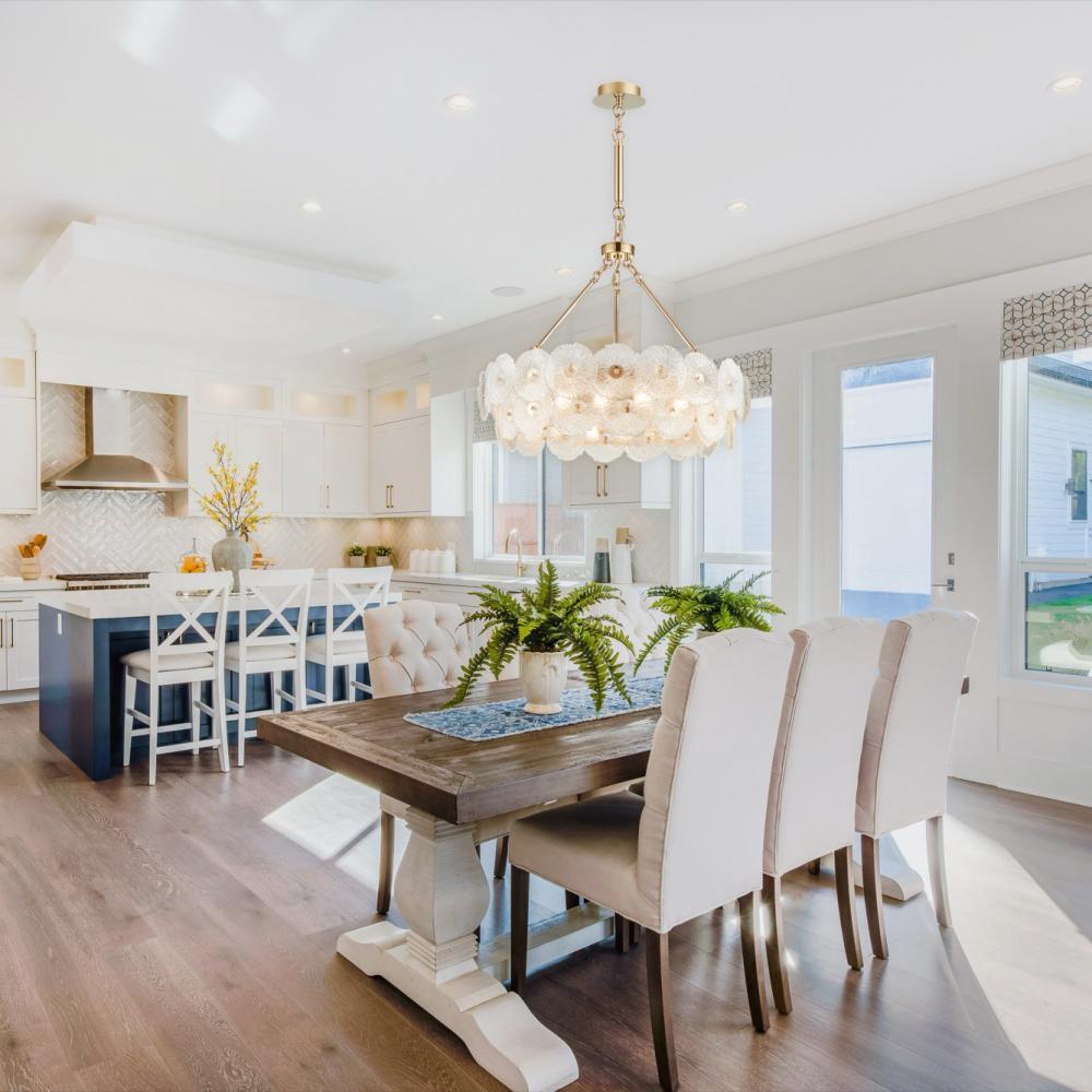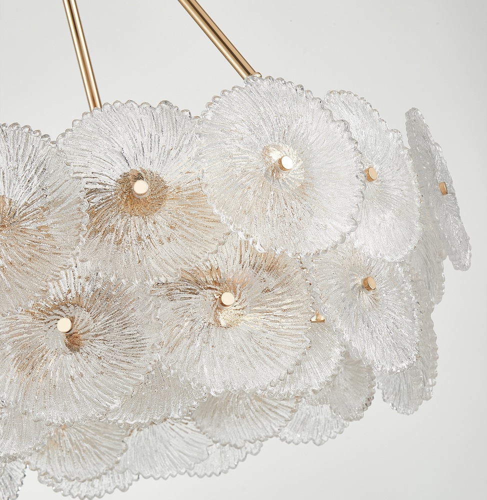 The defining feature of the Bloom collection lies in its enchanting glassware, meticulously crafted to resemble delicate and intricate flowers. The combination of the lustrous brass metal work and the floral-inspired glass elements makes this collection a captivating focal point for any space. The 18 light 31.5" diameter chandelier is shown. (height adjustable via chain)