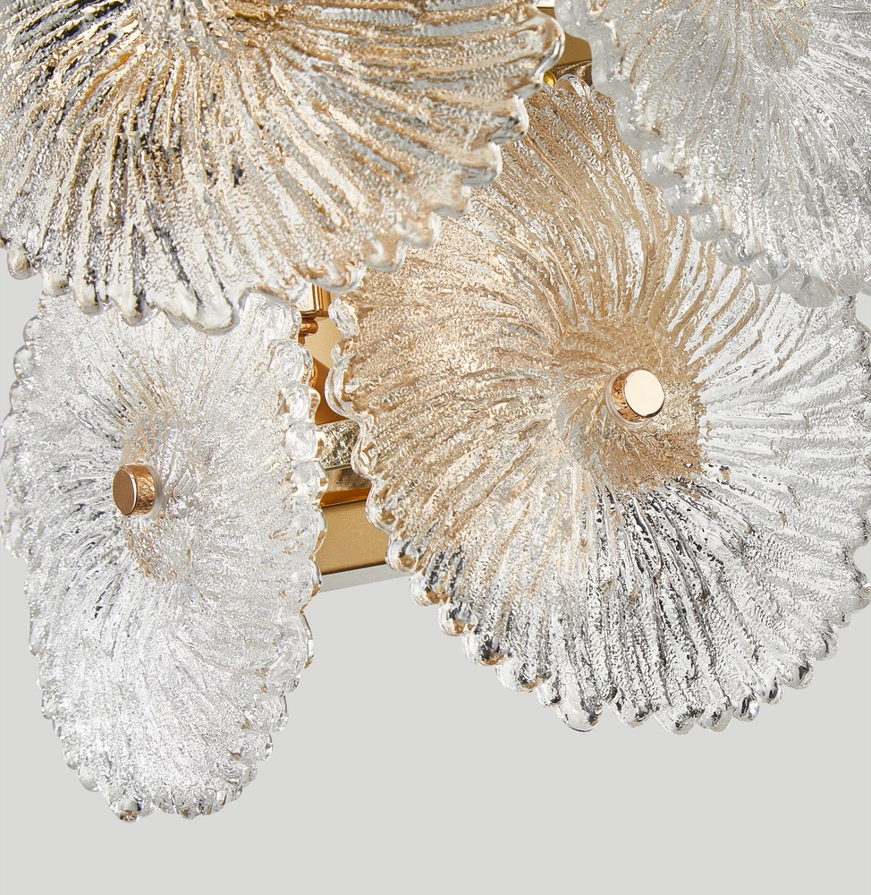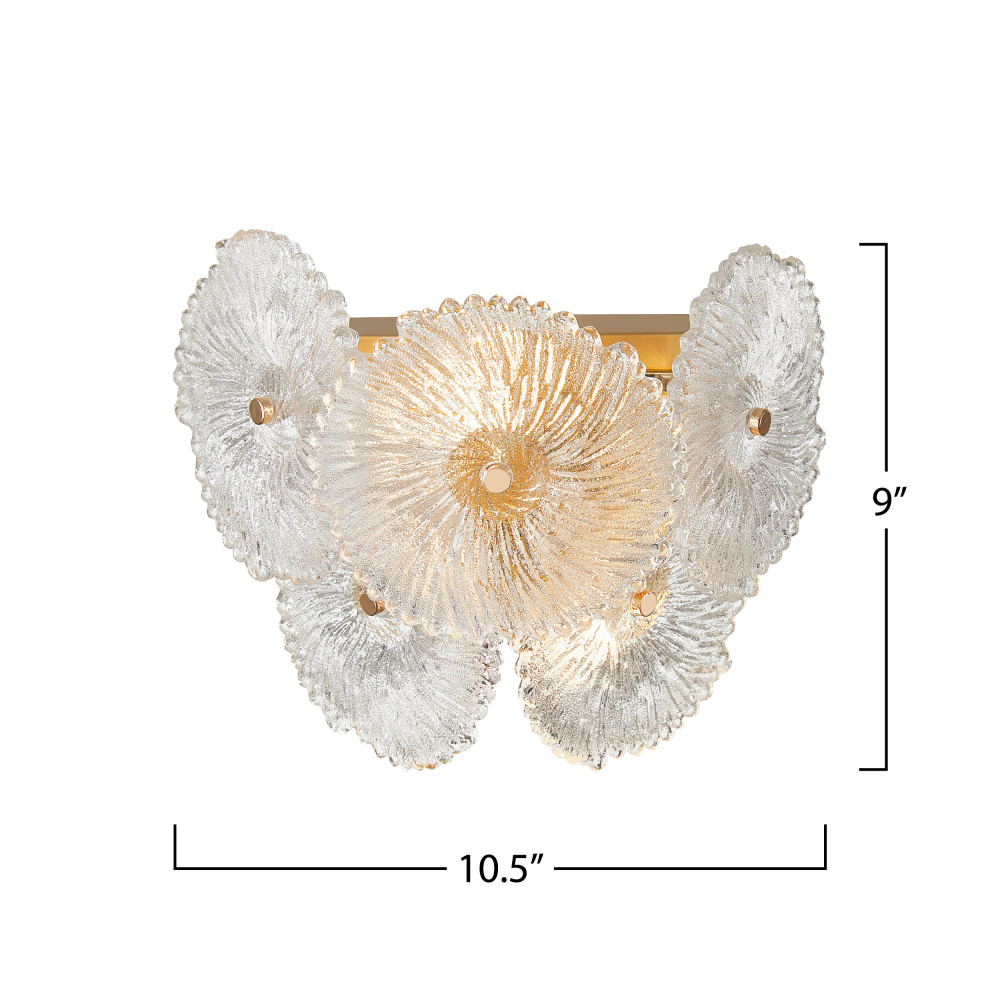 The defining feature of the Bloom collection lies in its enchanting glassware, meticulously crafted to resemble delicate and intricate flowers. The combination of the lustrous brass metal work and the floral-inspired glass elements makes this collection a captivating focal point for any space. The 2 light wall sconce is shown. (Matching chandeliers and wall sconce available)
