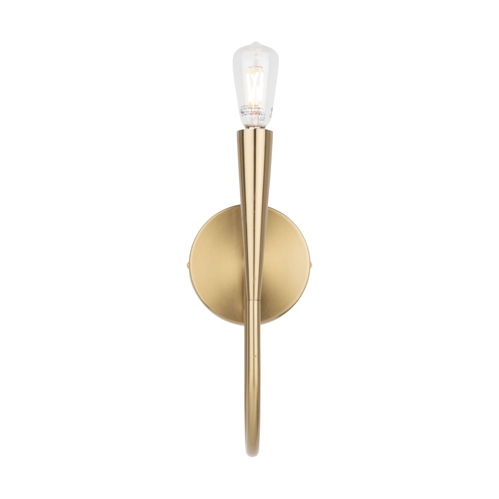 The Bronte Collection chandelier presents a classic design with tapered arms, accentuated by a warm brushed brass frame that exudes a touch of modern sophistication. Single light wall sconce shown. (Also available in a semi-gloss black finish)