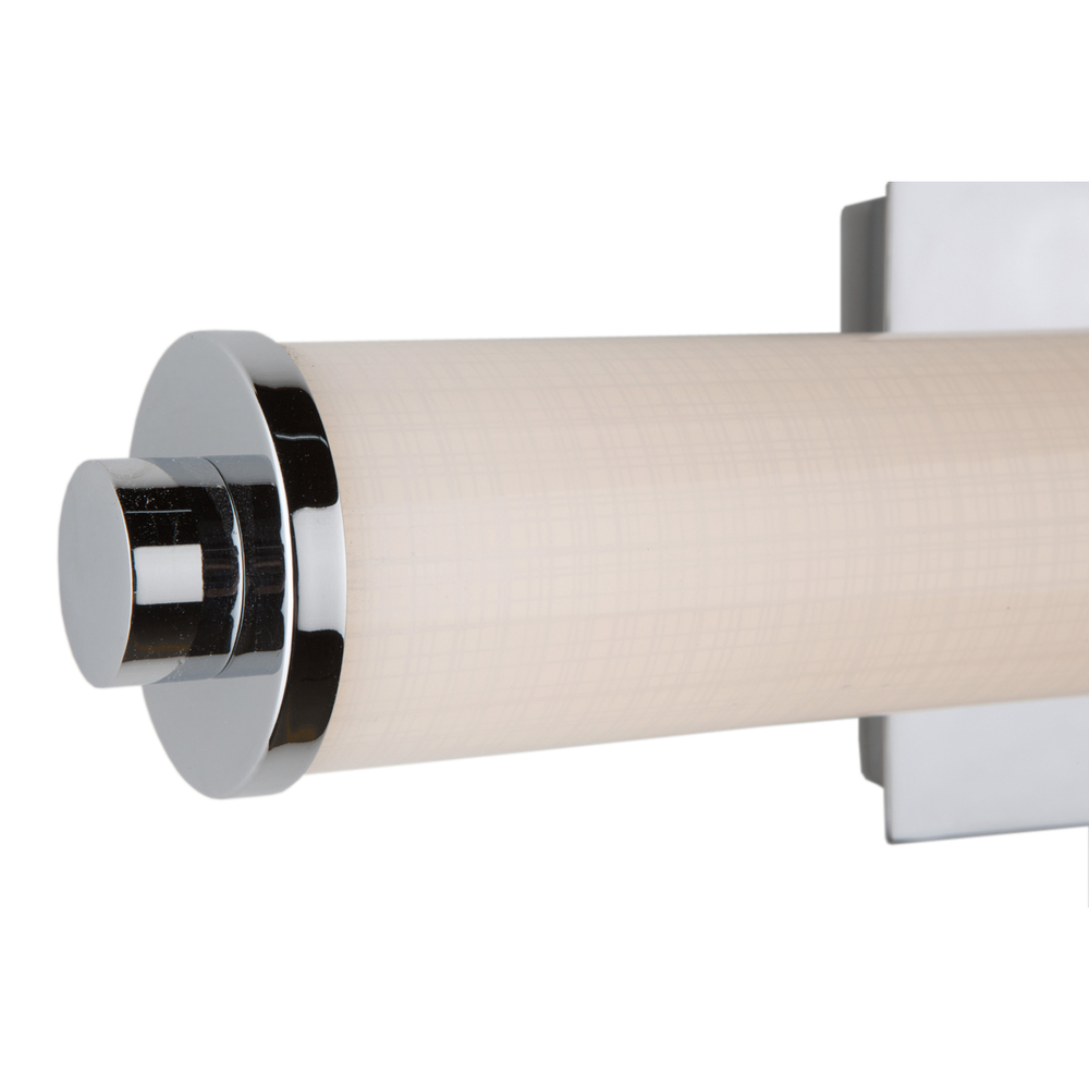 The "Buchanan" bathroom vanity collection features white linen glassware that is illuminated by bright LED. The back plate and sides are plated in shiny chrome. Super energy efficient and fantastic color rendition (CRI 90).