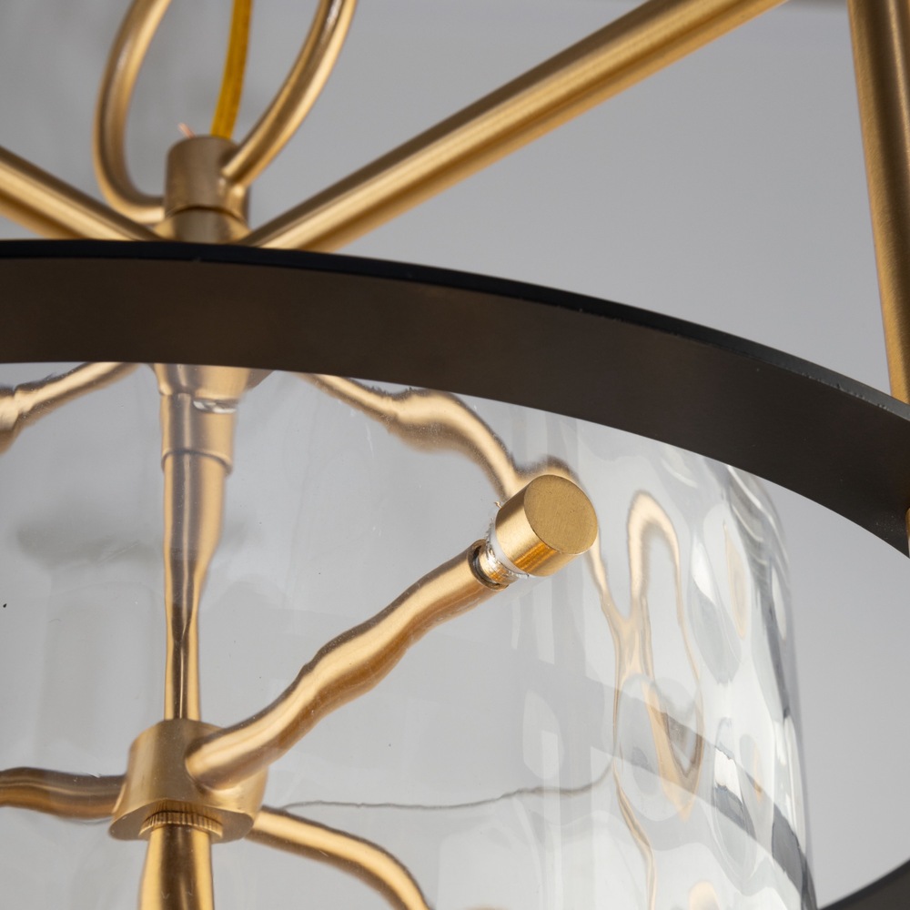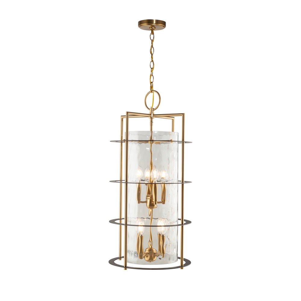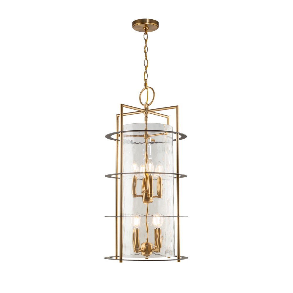 The Buford Collection is a striking ensemble that seamlessly blends elegance and modern design. Its defining features include a brass frame complimented with black rings, creating a contemporary contrast against the timeless appeal of the metal. The thick semi-transparent water glass add opulence and warmth, making these lanterns style chandeliers a sophisticated focal point for any space. 8 light lantern style chandelier for entrance, staircase, or foyer (height adjustable and compatible with sloped ceilings).