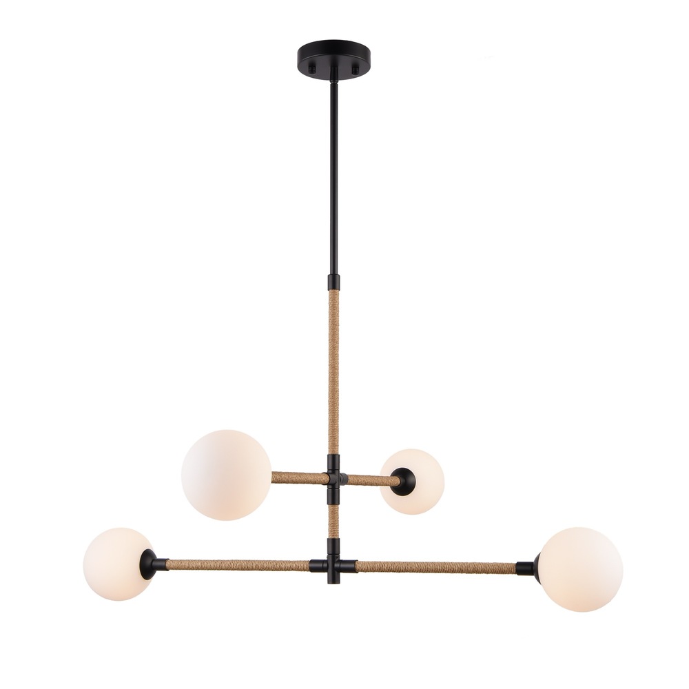 The Capilano collection features an elegant design enveloped in stylish natural jute, complemented by a black metal frame and circular white acid glassware. The fixture boasts clean lines, enhancing its overall aesthetic appeal. The careful integration of these elements creates a sophisticated and attractive lighting solution. The model shown is a 4 lite height adjustable chandelier. (built in hangstraight for sloped ceilings) (G9 socket)