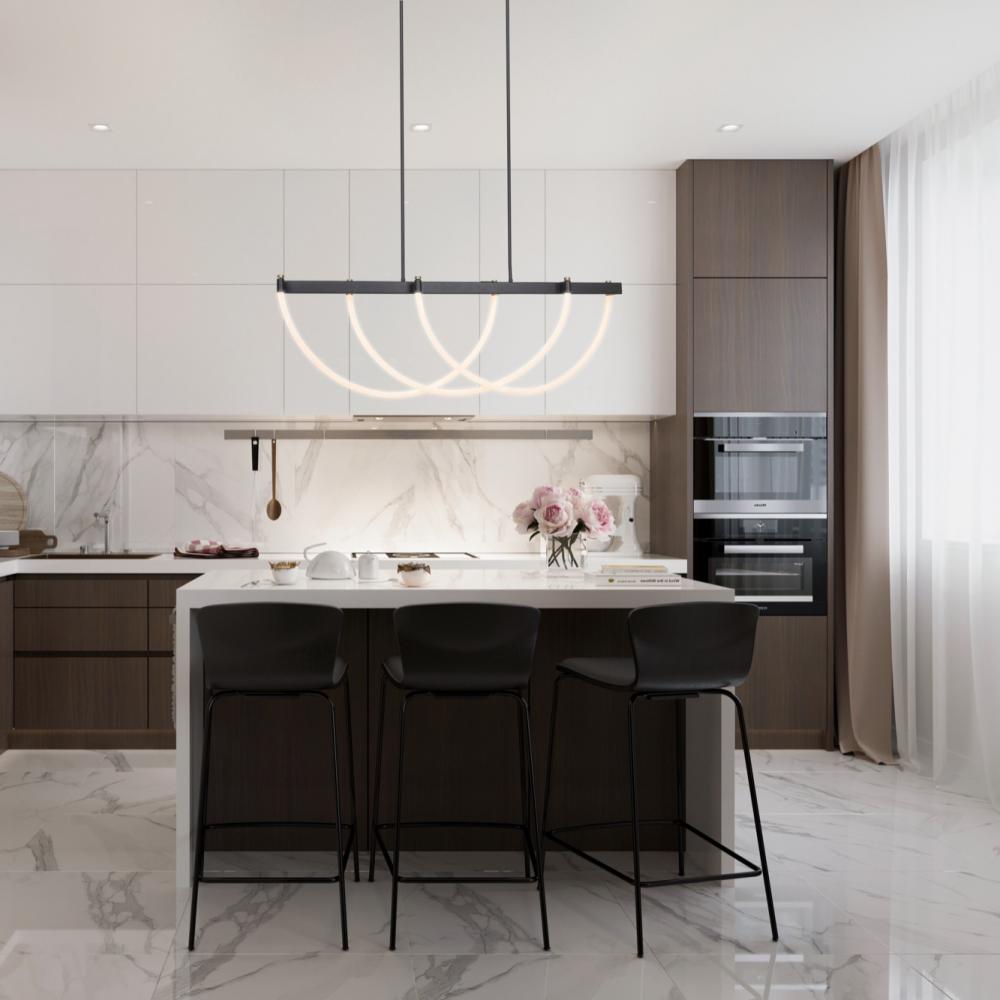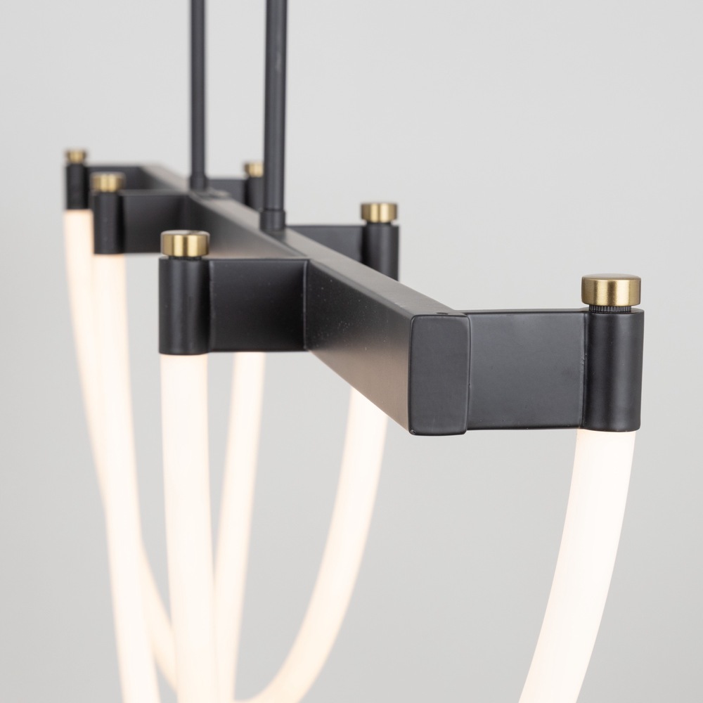 The Cascata Collection, designed by Kevin Kraemer, features a sleek and minimalist design, combining precision craftsmanship with modern aesthetics. The frame is black with brass accents. The bright LED illuminated silicone drapes throughout giving this collection an illusion of weightlessness. This eye-catching collection is a perfect complement to any surrounding. The model shown is a linear island type chandelier.