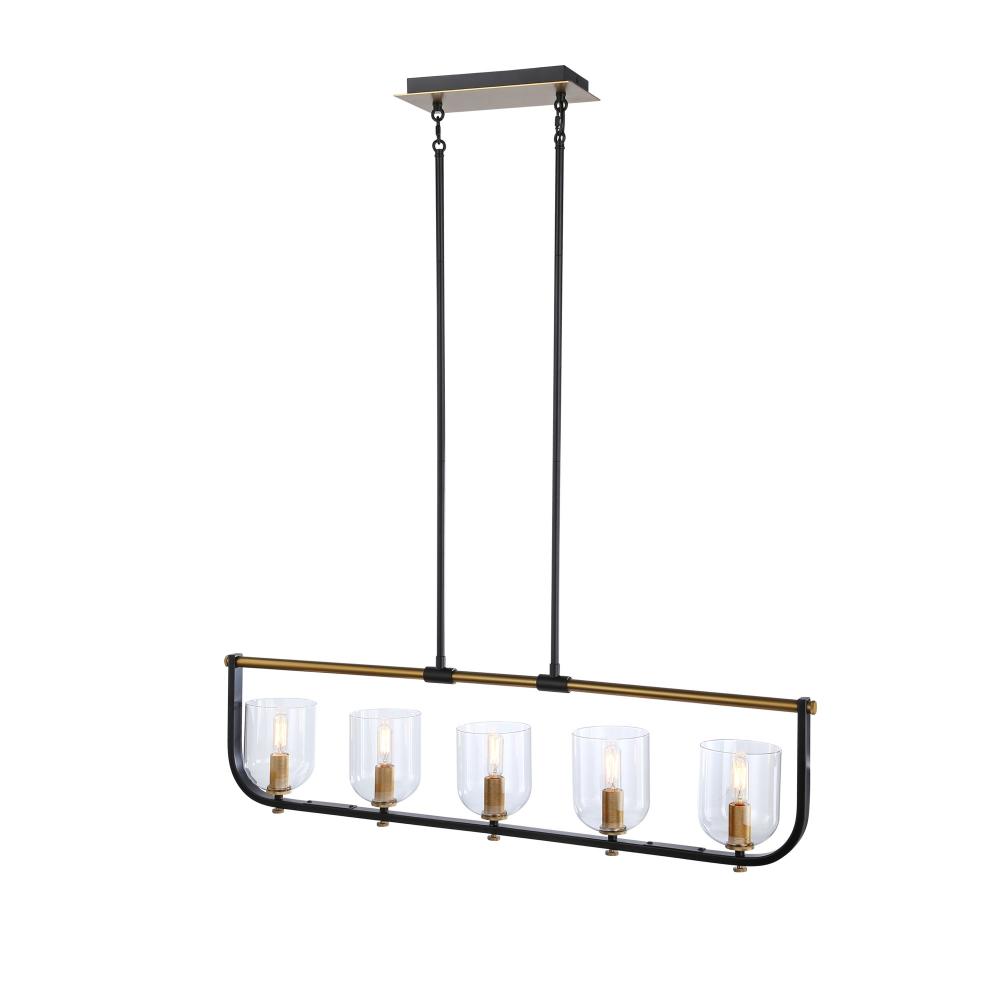 The Cheshire Collection is a spectacular grouping of chandeliers designed by Kevin Kraemer. The frames are black and complemented with brass. There is fine attention to all the details from the frame shape matching the curves in the glass to the exquisite knural parts on the candle covers and knobs. (Also available in black with nickel accents). Island chandelier shown.