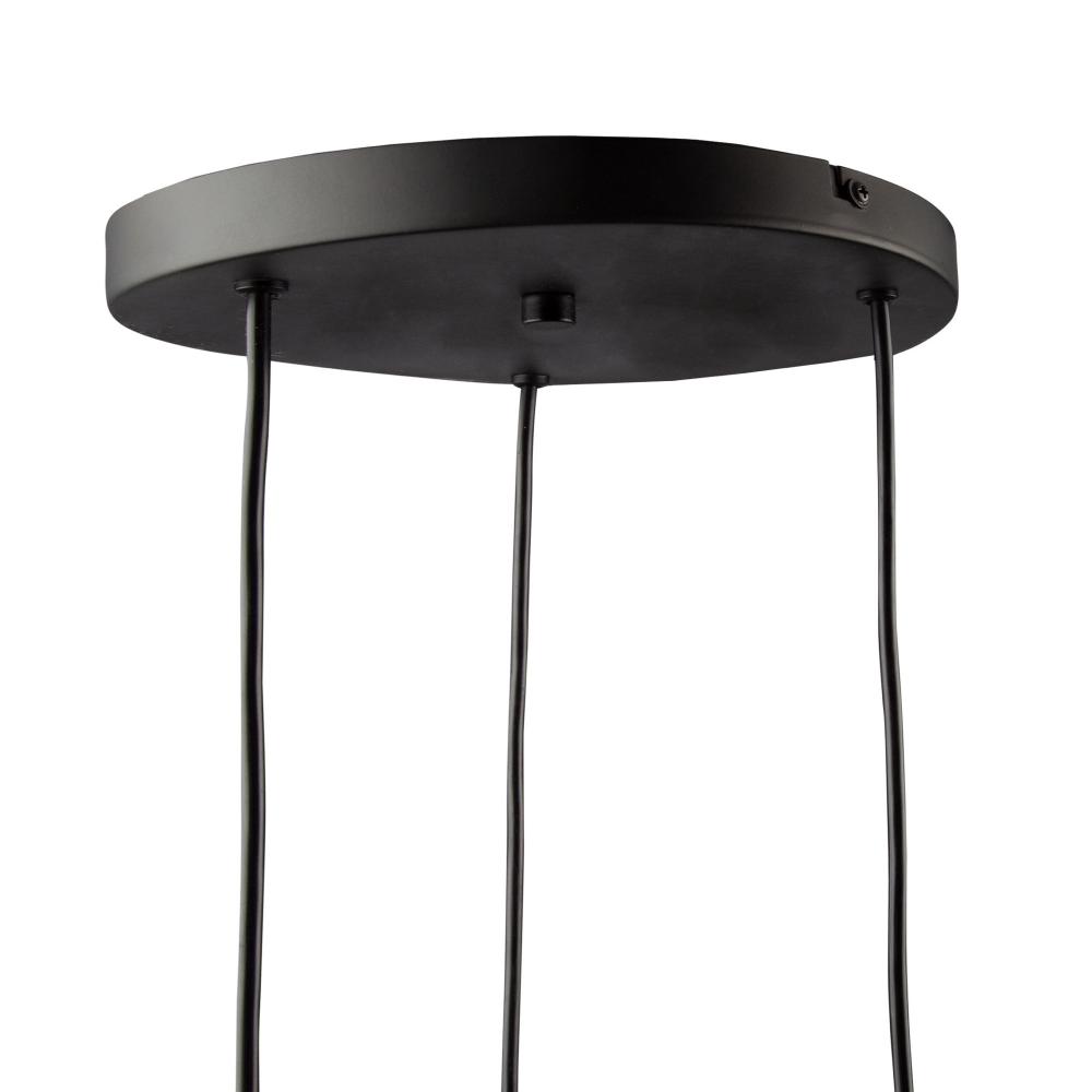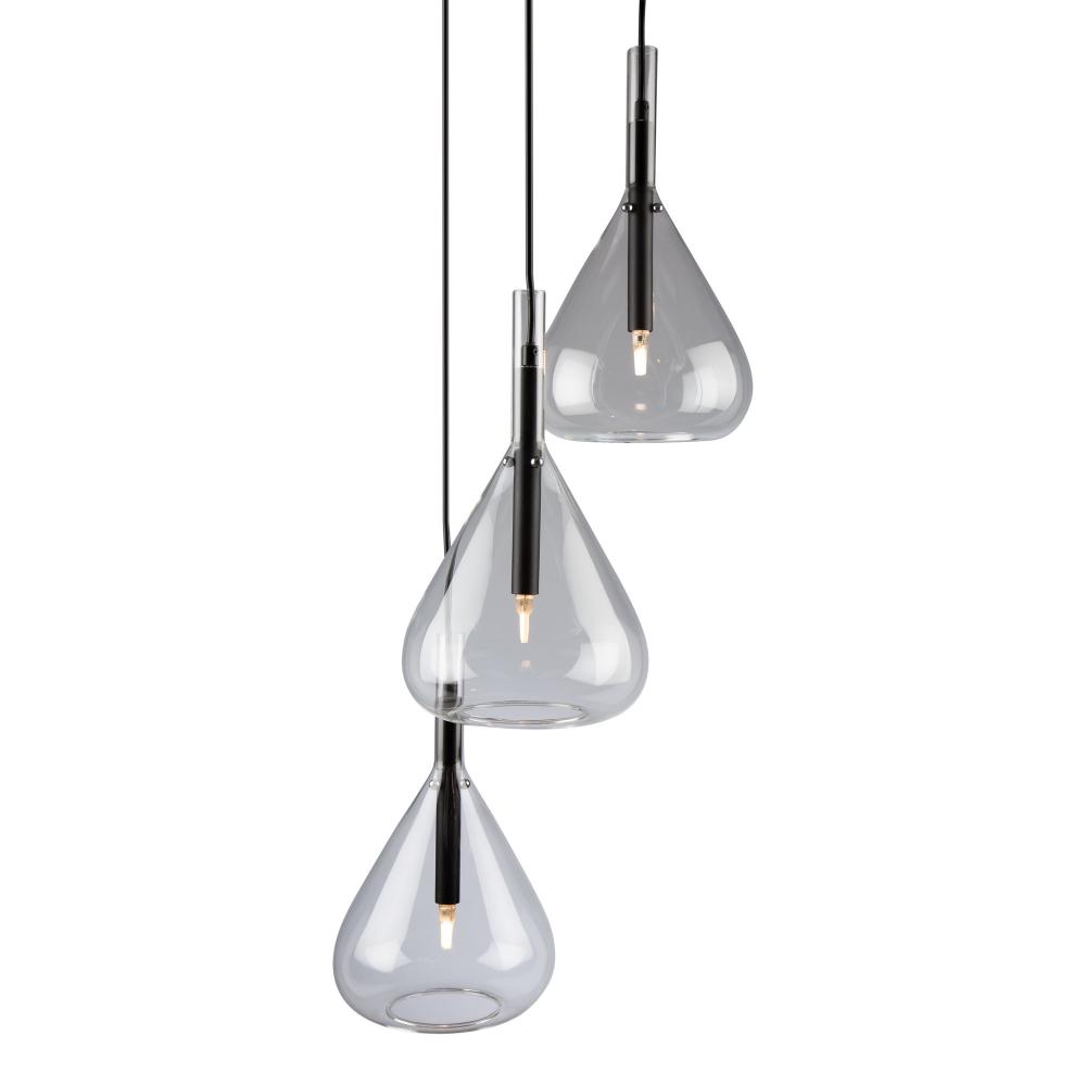 The Conic collection features a uniquely shaped glass design suspended on black frames. The glass is suspended by 3 nickel bullets to give it a floating effect. The bottom of the glass is open for each access to the bulbs. To finish off the design, the wiring has black textile covering.