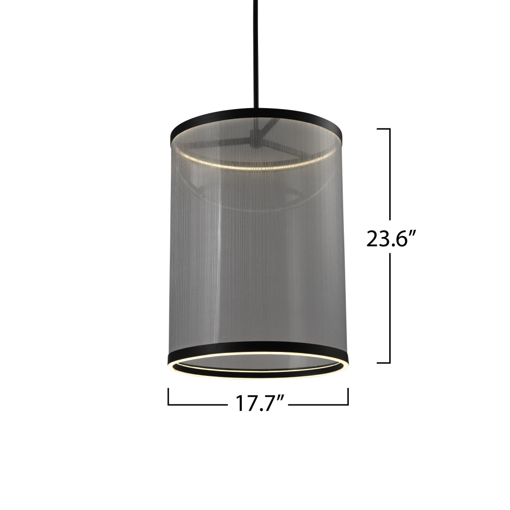 The Cora collection large chandelier enchants with its modern elegance, showcasing a sleek black metal frame paired with a silver organza hardback shade. This LED chandelier exudes a soft yet striking glow, illuminating through its top and bottom rings to create a warm ambiance. Equipped with a versatile 5CCT switch, it offers customizable lighting to suit any mood or setting. This design seamlessly blends functionality and style, making it a refined statement piece for any interior.