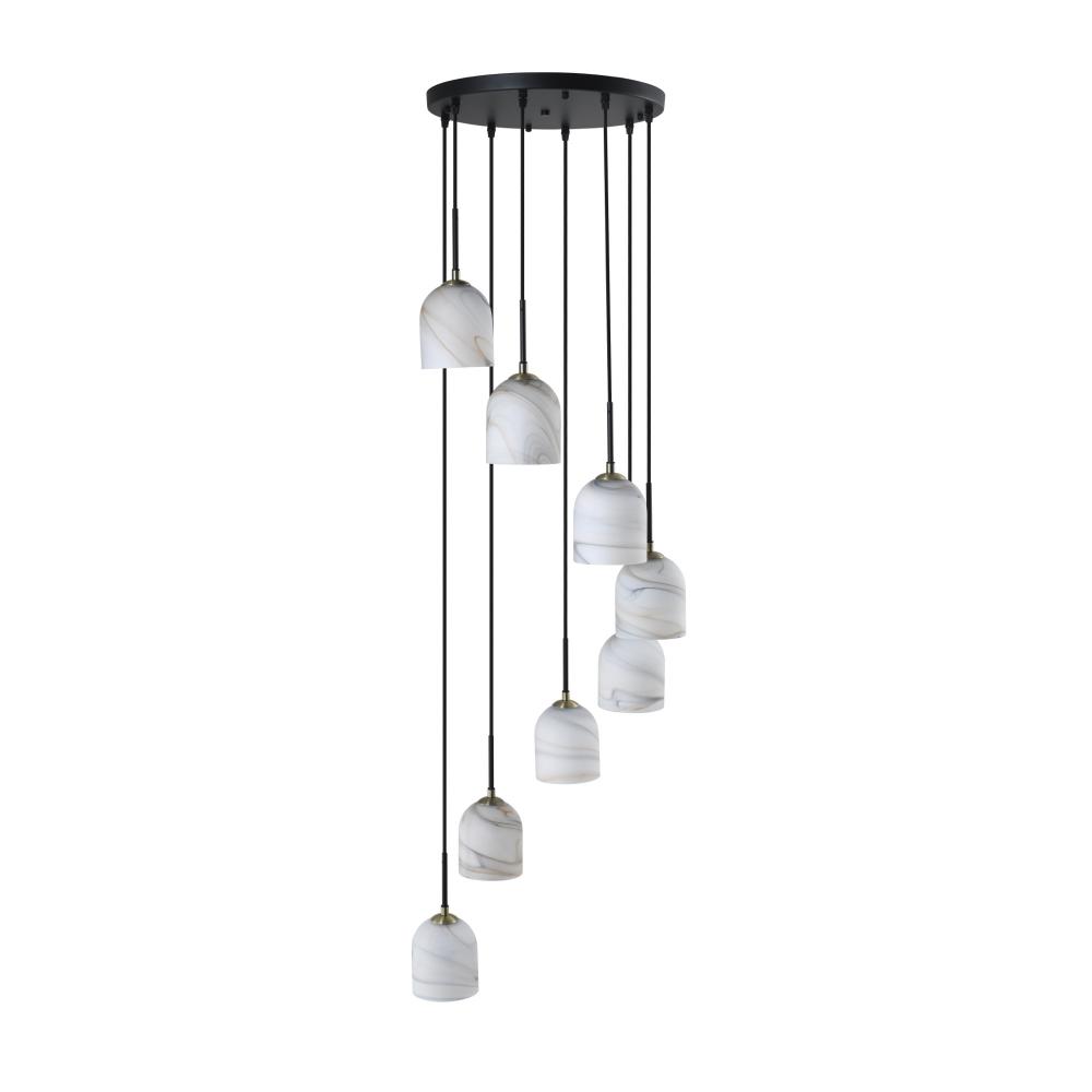 The Crema collection 8 light entry foyer chandelier by Steven Sabados of S&C radiates understated sophistication with its alabaster-style swirl glass, casting a warm, inviting glow. Its sleek black frame is beautifully complemented by brushed brass accents, creating a perfect harmony of modern sophistication and classic charm. Rods included for easy height adjustment to suit different height requirements.