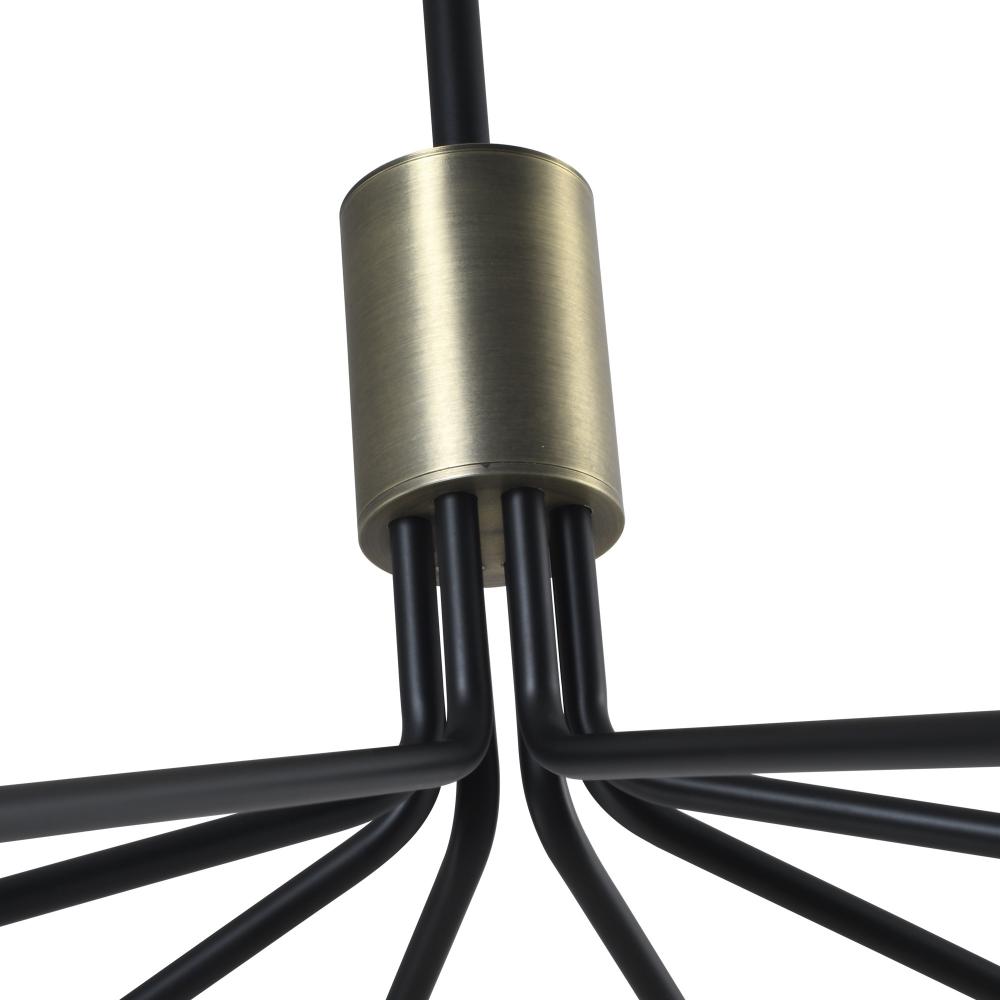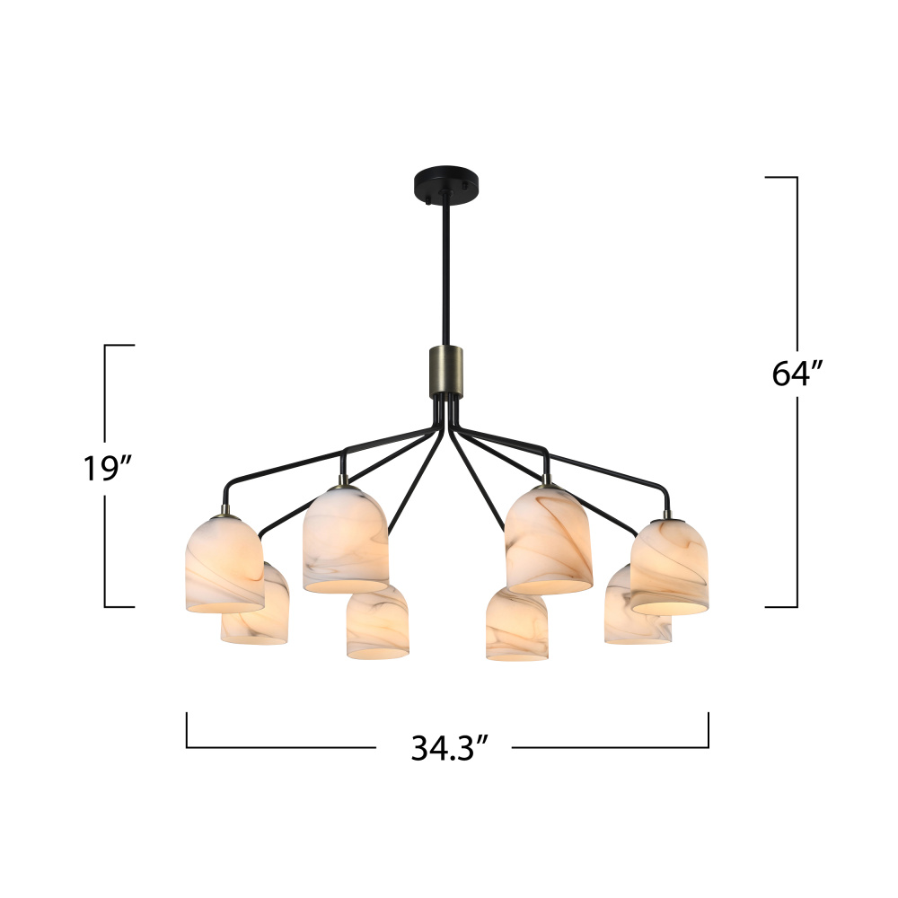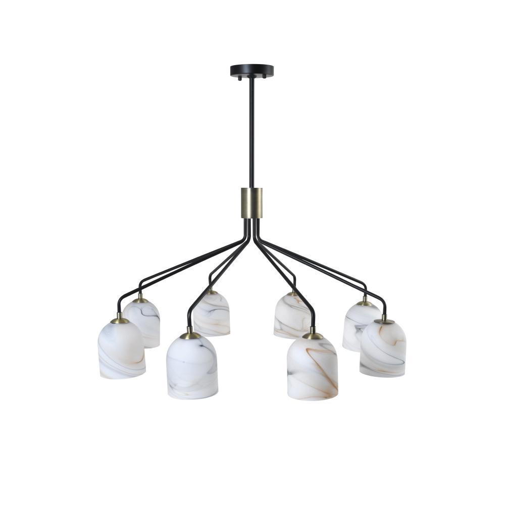 The Crema collection 8 light round chandelier by Steven Sabados of S&C radiates understated sophistication with its alabaster-style swirl glass, casting a warm, inviting glow. Its sleek black frame is beautifully complemented by brushed brass accents, creating a perfect harmony of modern sophistication and classic charm. Rods included for easy height adjustment to suit different height requirements.