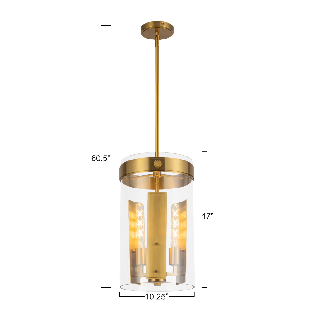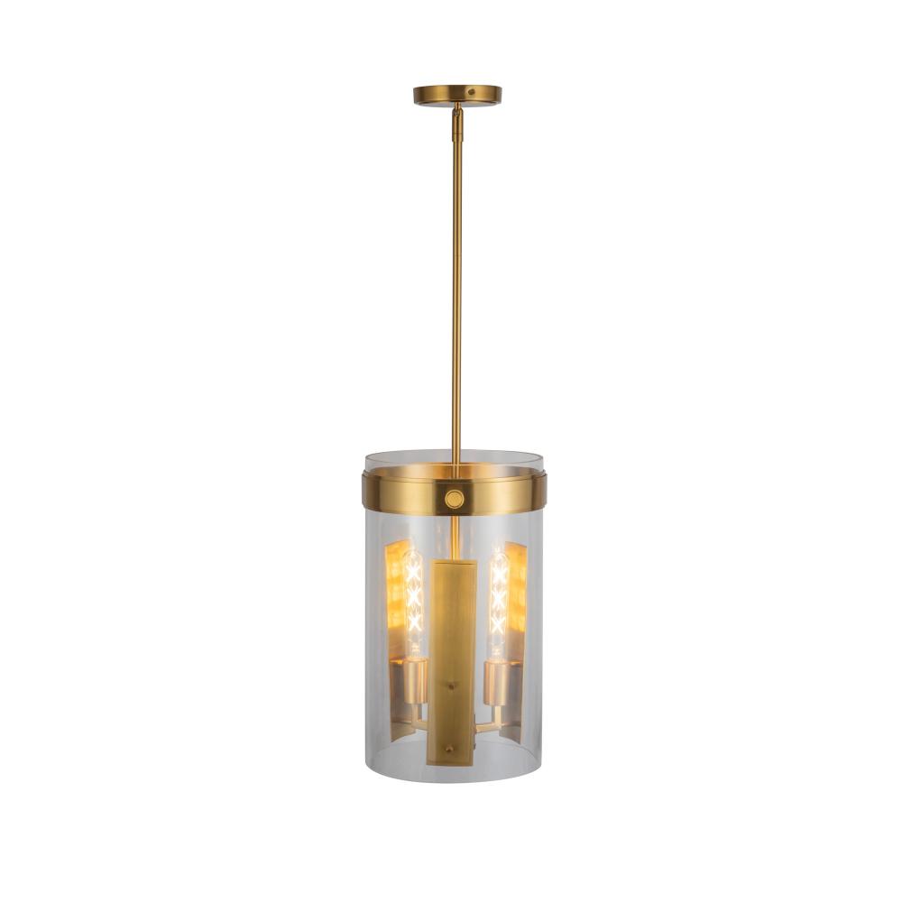 The pendant from the Dahlia collection exudes contemporary elegance with its rich harvest brass metal accents and transparent glass shade, allowing light to shine through in a warm and inviting glow. Designed by Kevin Kraemer, its cylindrical silhouette captures a refined balance between industrial and modern design, highlighted by highly detailed knurl knobs that add a touch of craftsmanship and sophistication. This versatile piece transforms ordinary ceilings into breathtaking focal points, combining artistry and functionality seamlessly.