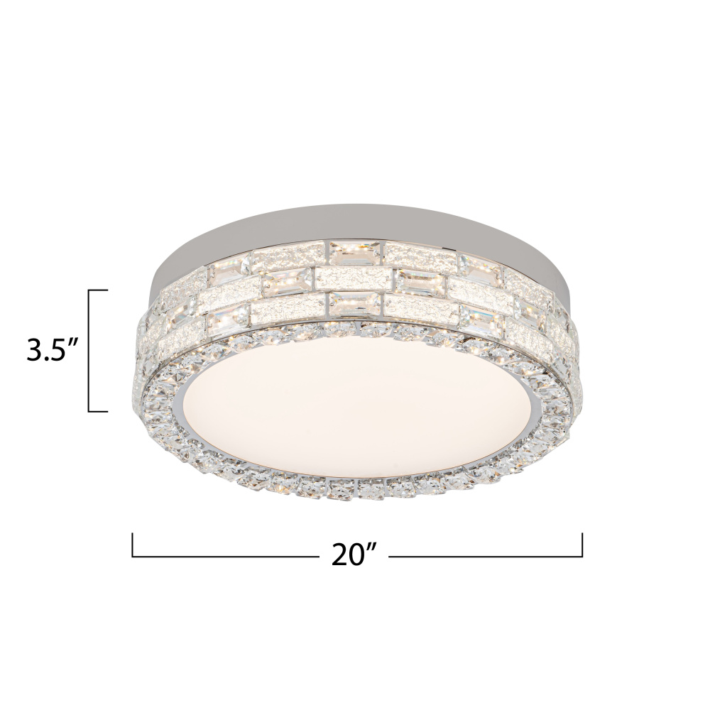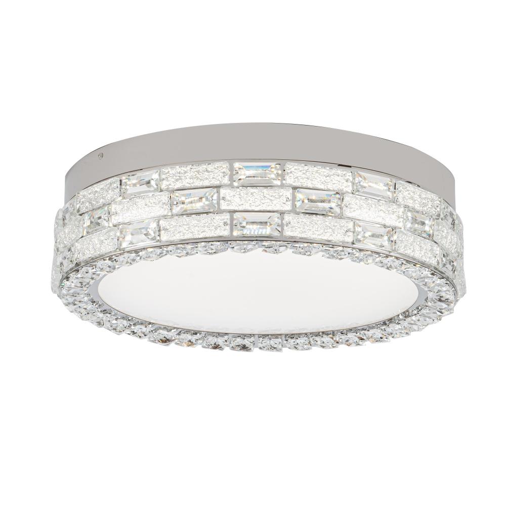 Glistening like a crown of starlight, this LED crystal flushmount from the “Elegance” collection offers a breathtaking harmony of luxury and functionality. Its polished nickel frame embraces a dazzling array of crystals, while the 3CCT switch allows you to tailor the ambiance with warm, neutral, or cool light (3K, 4K, 5K). This model has a glass bottom lens.