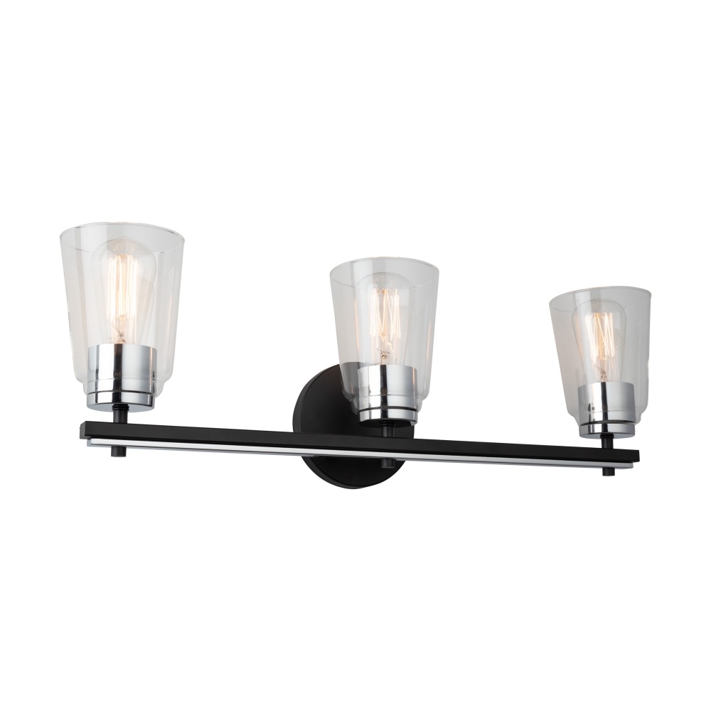 The Essex collection features elegant clear glassware, adding a touch of sophistication to any bathroom decor. Its standout design is characterized by a striking dual-tone finish, combining sleek black and chrome elements seamlessly. This collection effortlessly blends modern aesthetics with functional utility, creating a stylish focal point for your bathroom space. 3 light wall sconce shown. (Also available in a single and 4 light versions.)