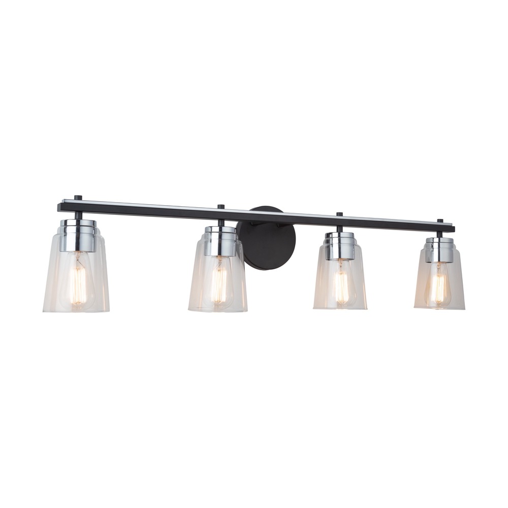 The Essex collection features elegant clear glassware, adding a touch of sophistication to any bathroom decor. Its standout design is characterized by a striking dual-tone finish, combining sleek black and chrome elements seamlessly. This collection effortlessly blends modern aesthetics with functional utility, creating a stylish focal point for your bathroom space. 4 light wall sconce shown. (Also available in a single and 3 light versions.)