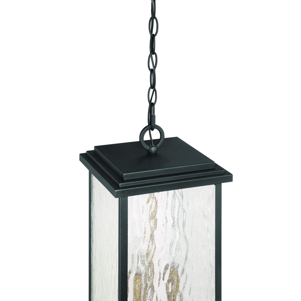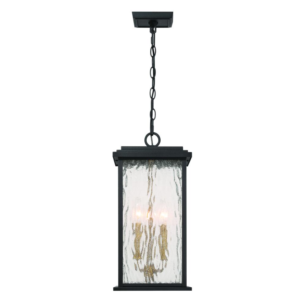 The “Estate” Collection outdoor pendant radiates classic allure, with its black metal frame offering a striking contrast to the mesmerizing water glass panels. Encased within, vintage brass candle covers and intricate metalwork glow warmly, evoking a sense of nostalgic charm. Perfect for enhancing any outdoor space, this sconce blends classic sophistication with modern durability.