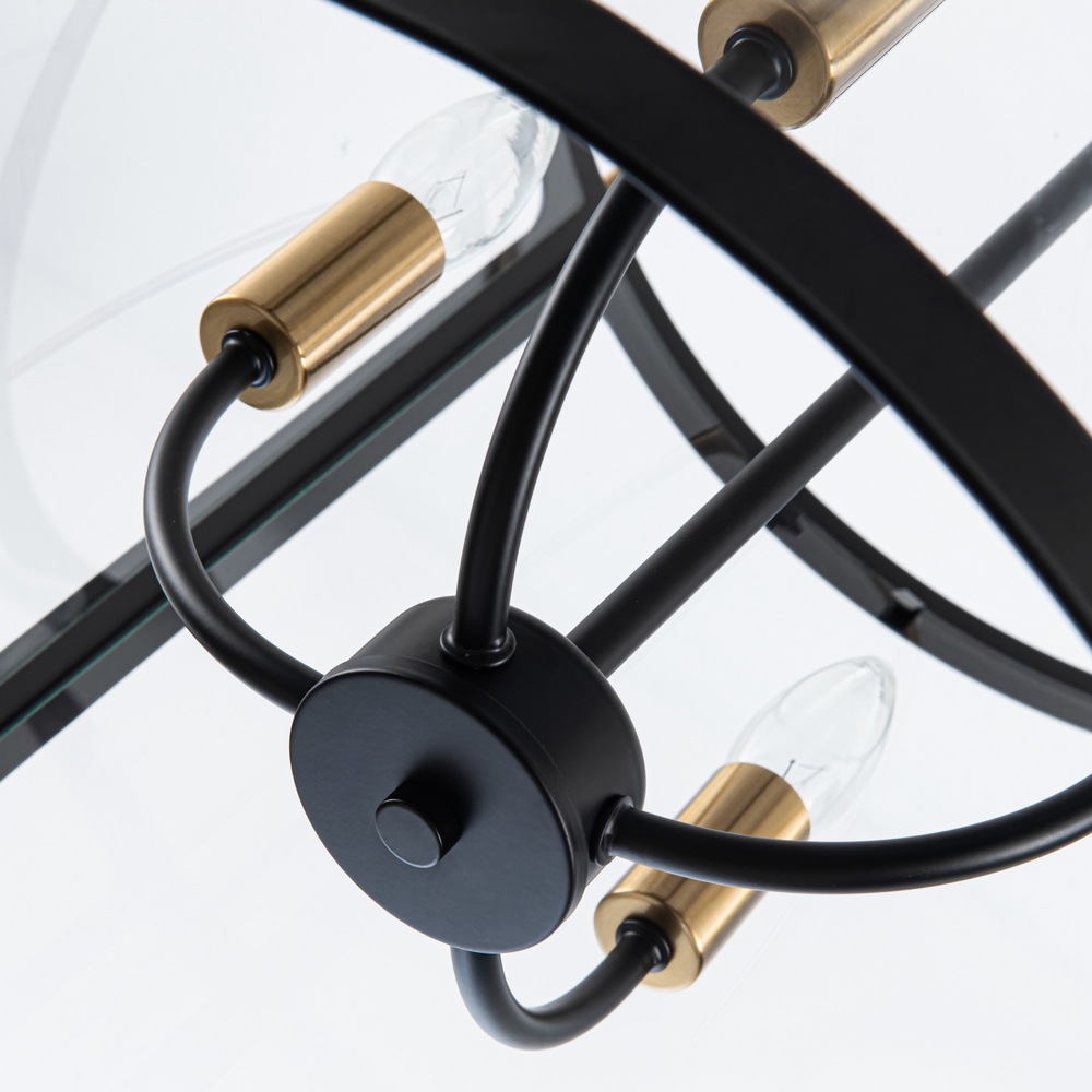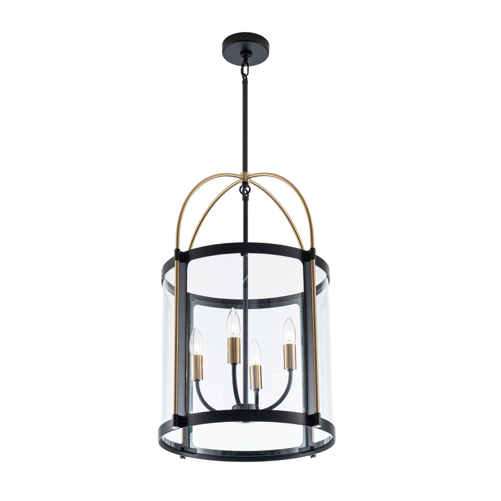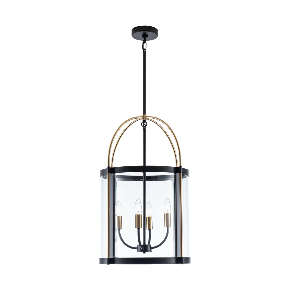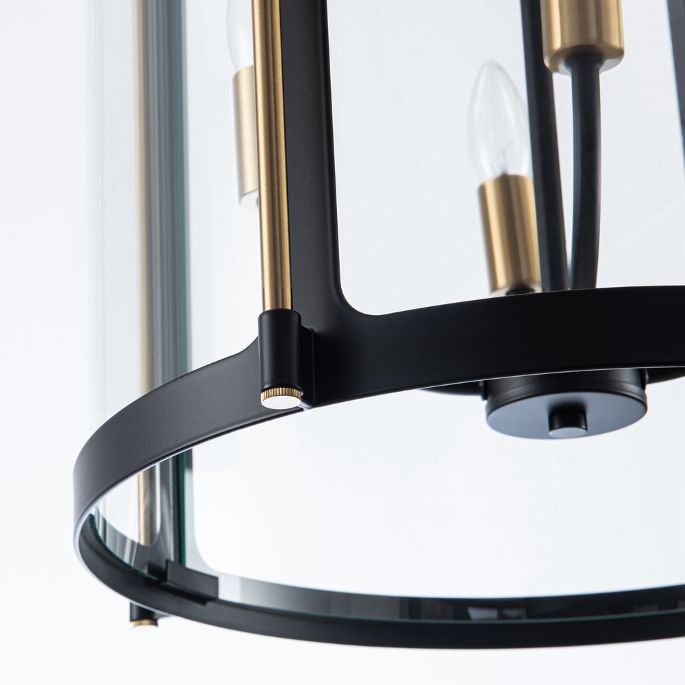 The Bonita Collection designed by Kevin Kraemer, features black frames with clear glassware and brass accents. The black metal frame provides a striking contrast to the warm brass accents, creating a visually stunning centerpiece for any space. Its intricate design, featuring a cage-like structure with glass panels, adds a touch of vintage charm while emitting a warm, inviting glow when lit. (4 lite - 17"D. lantern chandelier shown; smaller 13"D. also available)