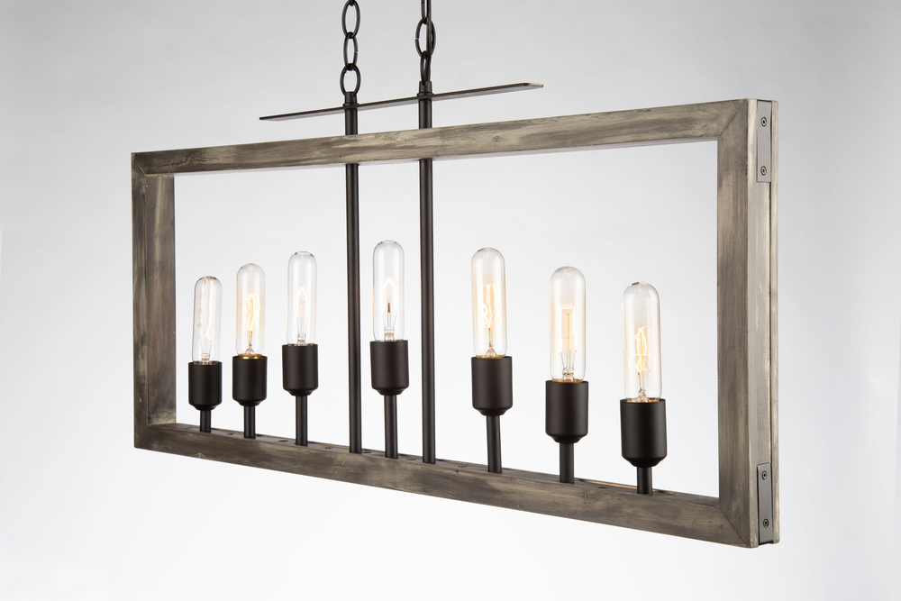 Made in North America with pride, this "Gatehouse" collection 7 light island linear features a beach wood finish with black metal work. The frame is made of authentic wood (pine).