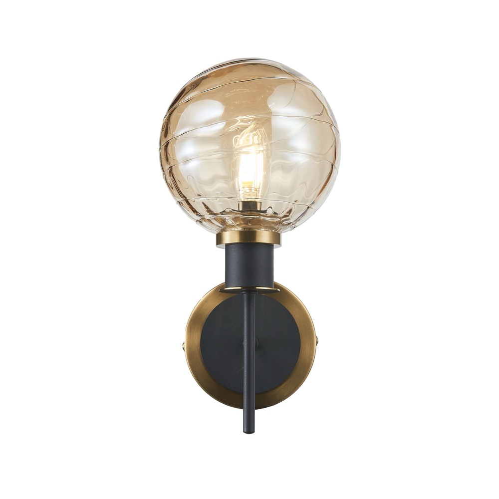 The Gem Collection with champagne glassware has a rich, translucent amber hue with a high level of clarity, allowing light to pass through while casting a warm, golden tone. This model is a wall sconce.