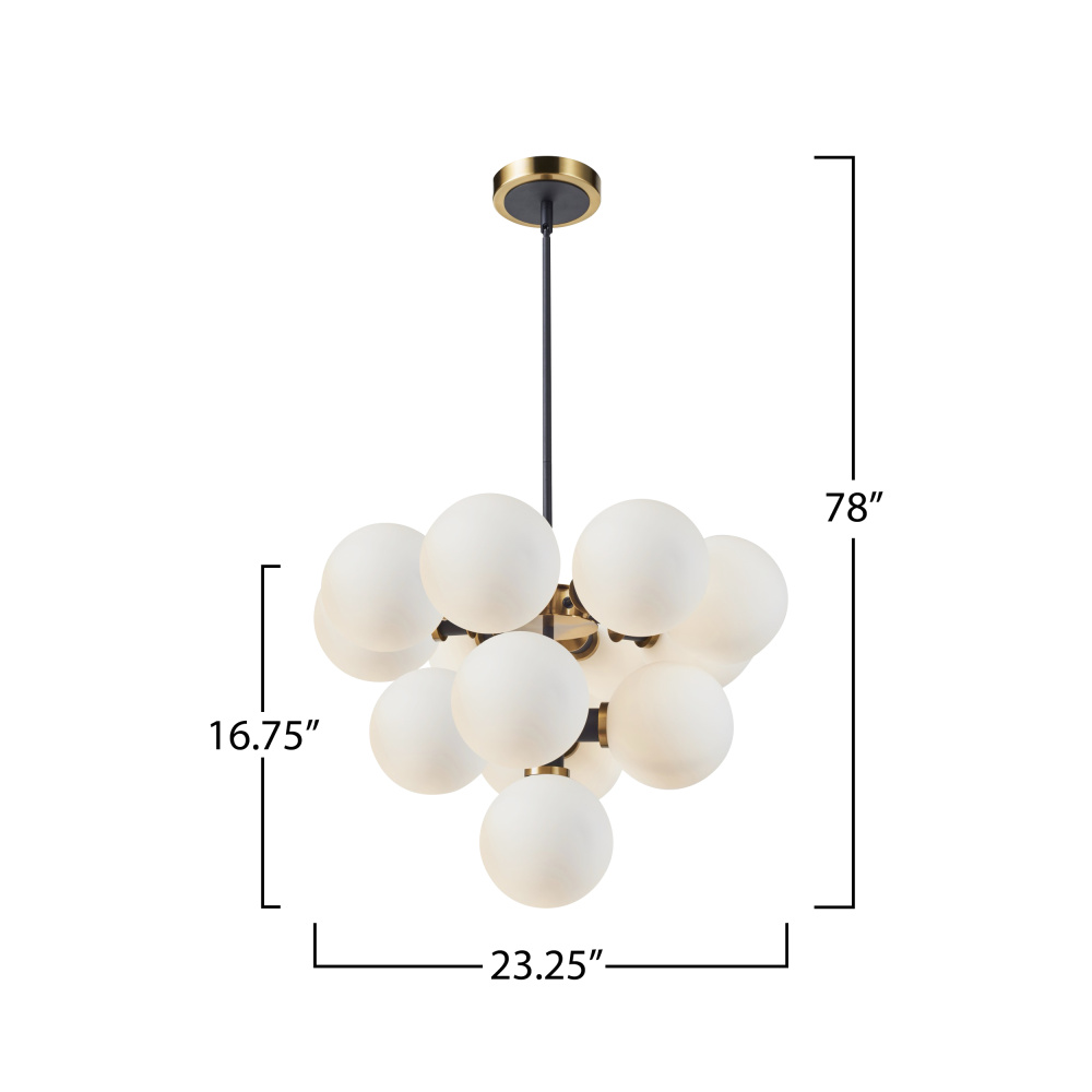 The Gem collection with acid white glass, also known as etched glass, is a type of glass that has undergone a process to give it a rich cloudy white appearance. When illuminated this glassware has a warm hue, which compliments its two-tone black and brushed brass framing. The model shown is a height adjustable 13 lite, 3 tier chandelier.