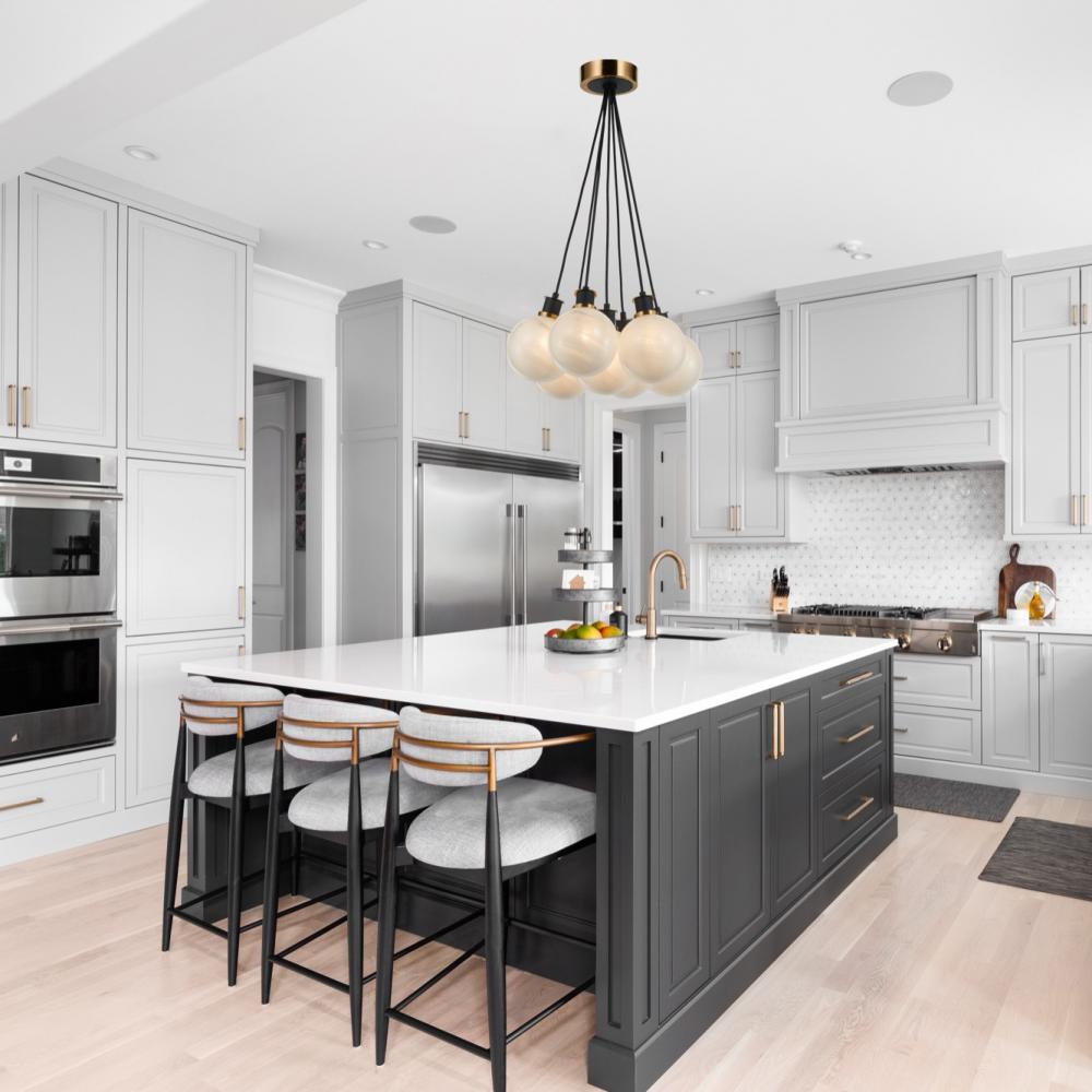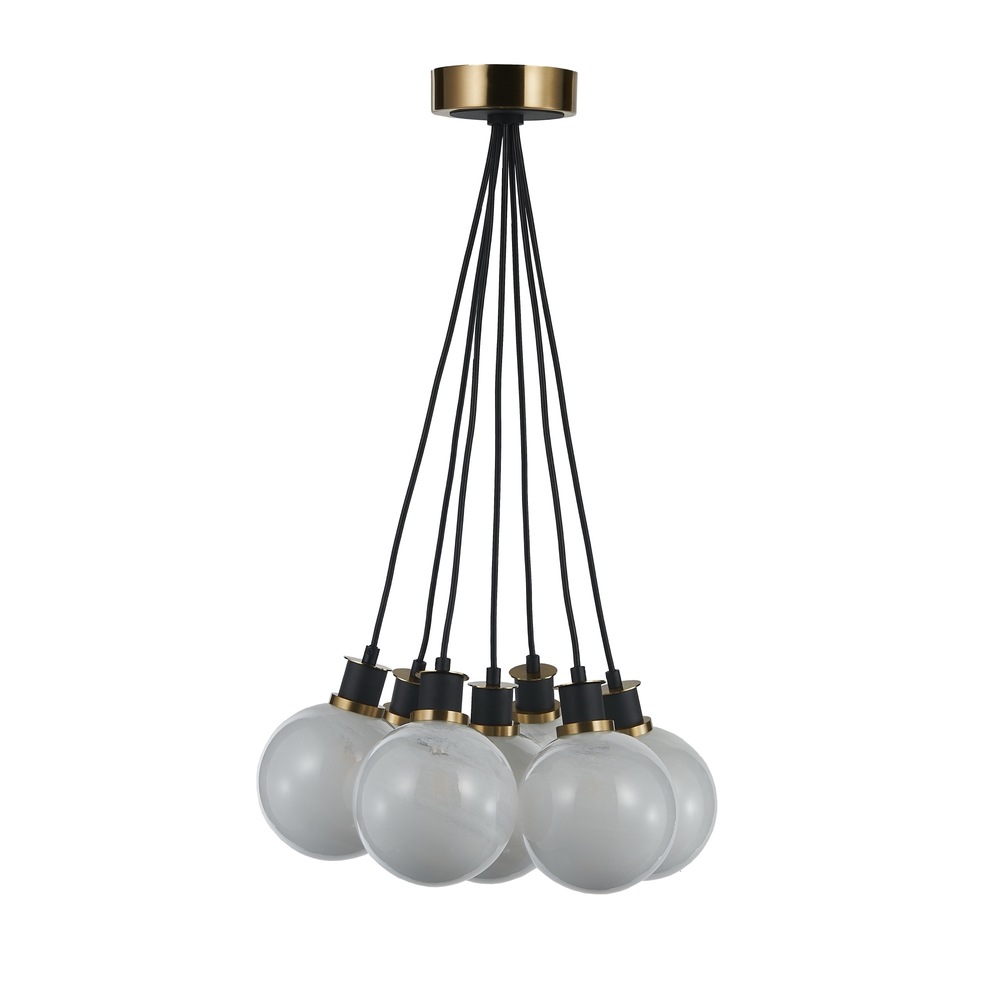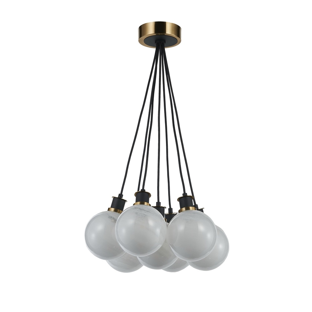 The Gem collection with “Blizzard” glassware exudes a sense of sophistication. Featuring a glossy textured white, the glass glows giving it a timeless and contemporary feel. The combination of the black framing with brushed brass is simply exquisite. A 7 lite height adjustable cluster type chandelier shown.