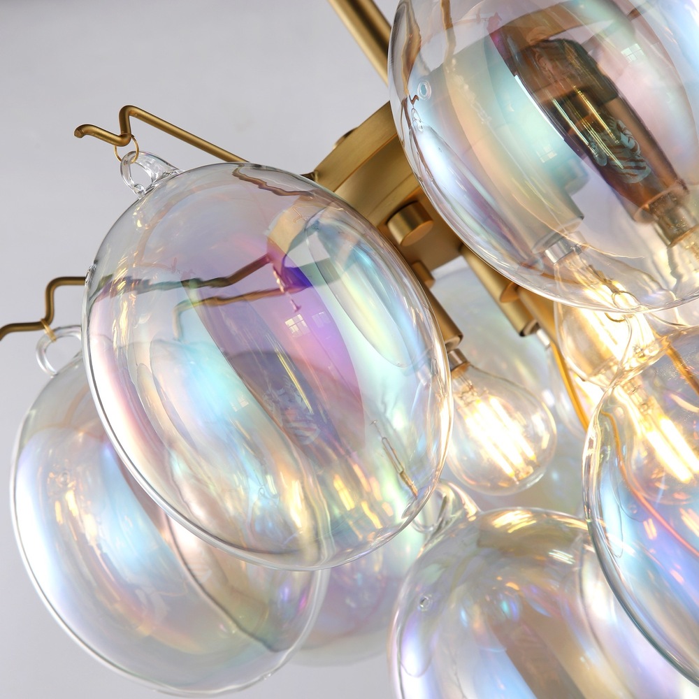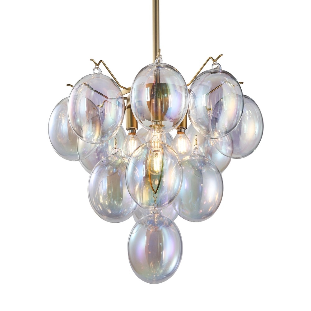 The Globo collection is characterized by its captivating iridescent floating bubble-type glassware, creating a mesmerizing and elegant rainbow visual effect. This unique glassware is compliment with brushed brass framing giving it a sense of warmth. With its harmonious blend of luminous aesthetics and refined materials, the Globo collection offers a distinctive and luxurious lighting solution for any space. 5 lite 3 tier chandelier shown. (height adjustable with included rods)