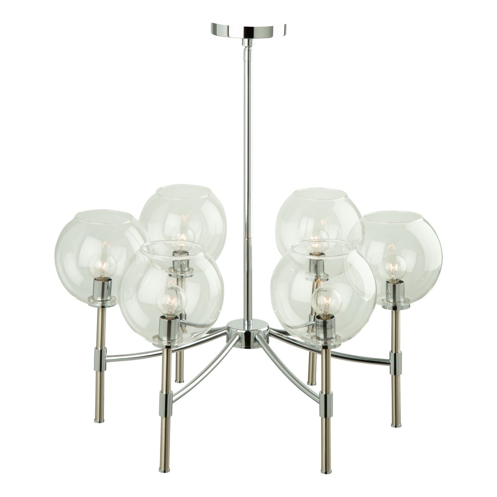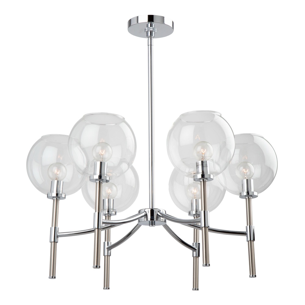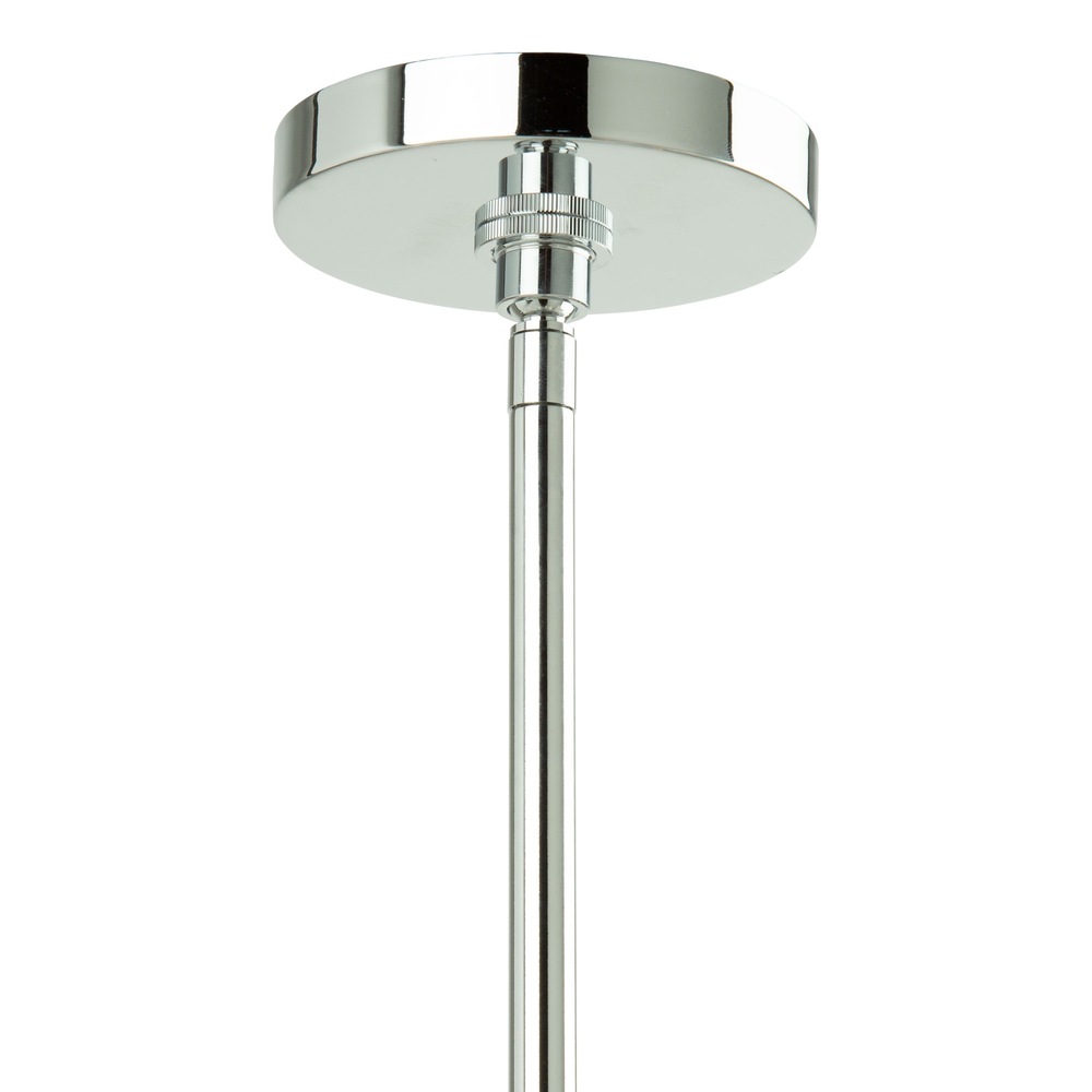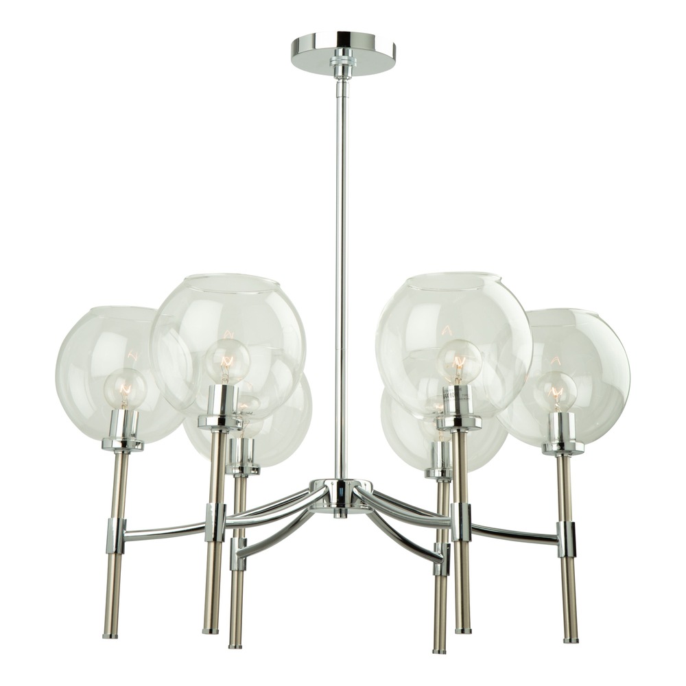 Inspired by Steven Sabados of S&C, the "Hamilton" collection is classic in design. It has tubular arms, center column and rods. The glassware is clear and round. Shown in the plated two tone version - chrome and brushed nickel. (Also available in satin brass). Comes with a hang straight for sloped ceilings and extra rods for desired height.