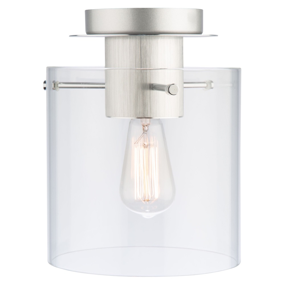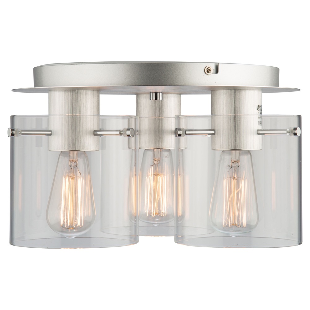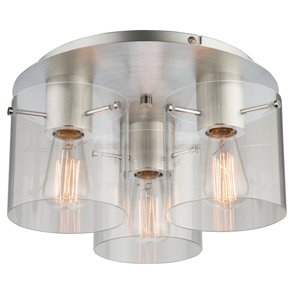 The "Henley Collection" 3 light flush mount features brushed aluminum metal work complimented with clear glassware. (also available in satin black metal work and mirrored glassware)