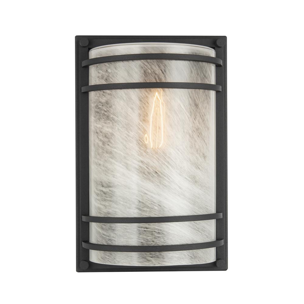 This outdoor wall sconce, part of the Keswick collection, radiates understated sophistication with its sleek black frame and gracefully arched silhouette. The “white swirl glassware” creates a mesmerizing, cloud-like texture, softly diffusing the light to cast a warm and inviting glow. Perfect for enhancing your outdoor spaces, it blends contemporary design with a touch of artistic sophistication.