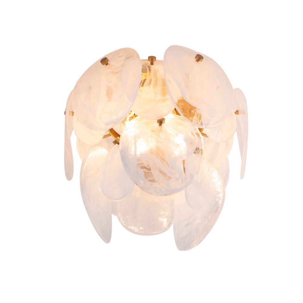 The Lily Collection exudes a delicate charm, captivating with its Murano-style glasswork in a wispy white finish. Each circular panel dances with subtle elegance, reflecting light in a manner that feels both luxurious and inviting. Complemented by a brushed brass frame, the design radiates a poetic blend of elegance and allure. This chandelier casts a spell of enchantment, illuminating your space with a touch of dreamy opulence.