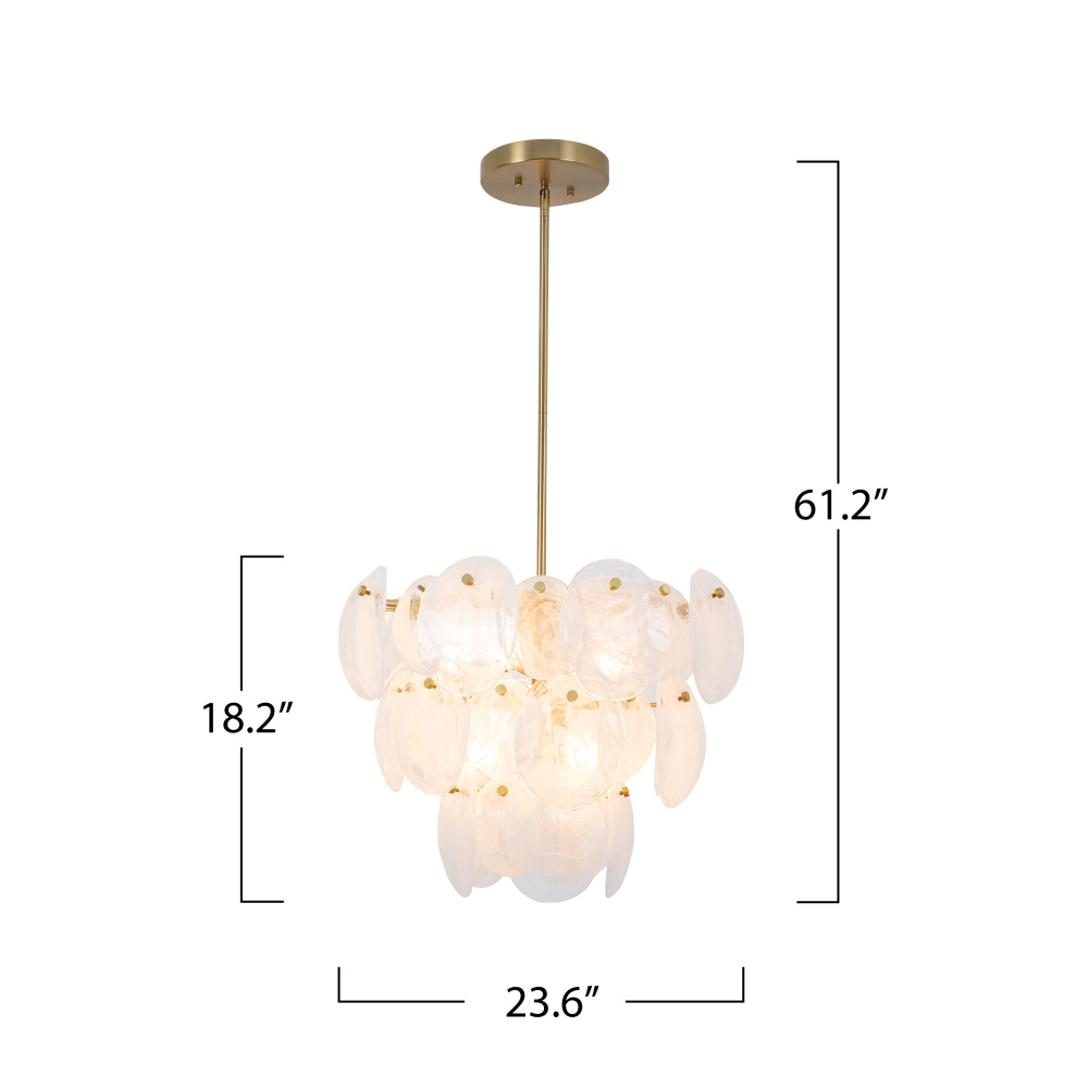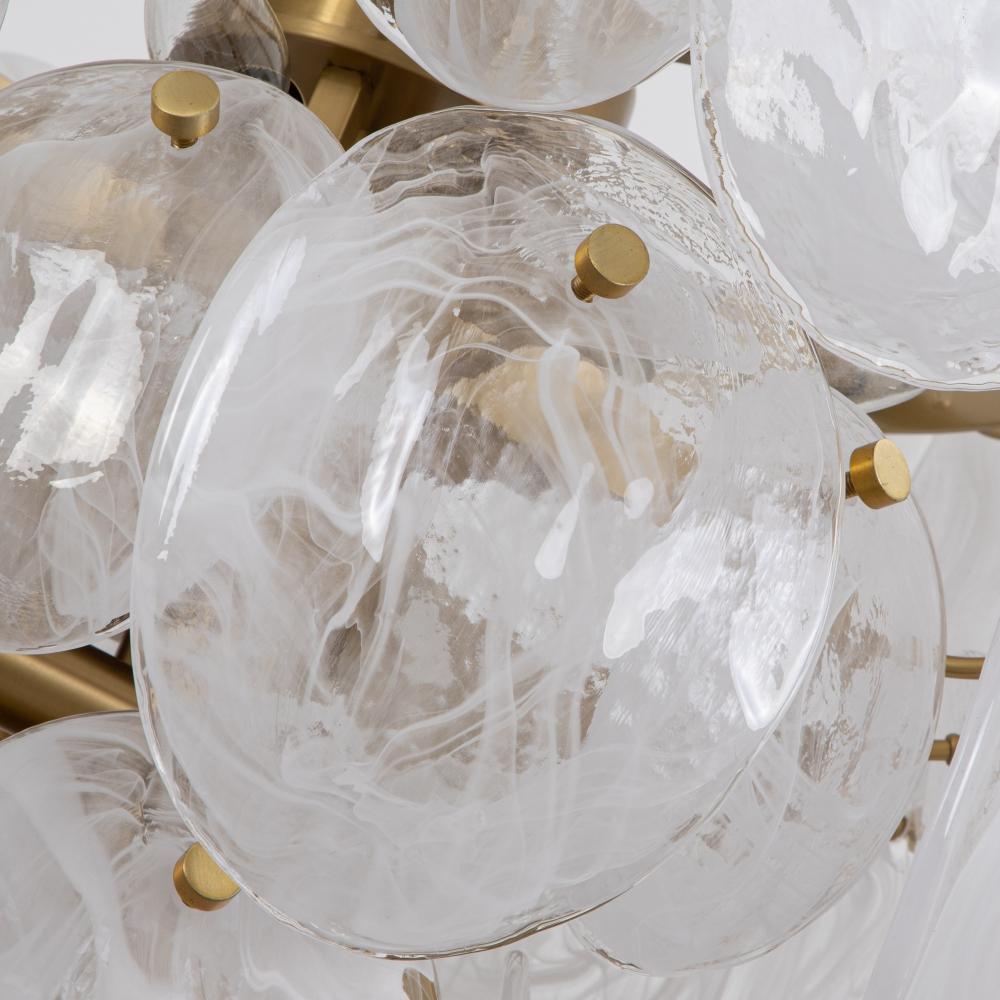The Lily Collection exudes a delicate charm, captivating with its Murano-style glasswork in a wispy white finish. Each circular panel dances with subtle elegance, reflecting light in a manner that feels both luxurious and inviting. Complemented by a brushed brass frame, the design radiates a poetic blend of elegance and allure. This chandelier casts a spell of enchantment, illuminating your space with a touch of dreamy opulence.