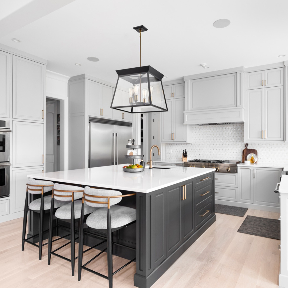 The Lucian collection, designed by Kevin Kraemer, is a modern twist on a classical lantern style light. Shown in black with brass accents (also available in a rich plated brushed brass). Clear panel glassware surrounding the bulbs. The model shown is a 4 light chandelier with a diameter of 18". (aslo available in a smaller 12" diameter model) Great for any area of the home.