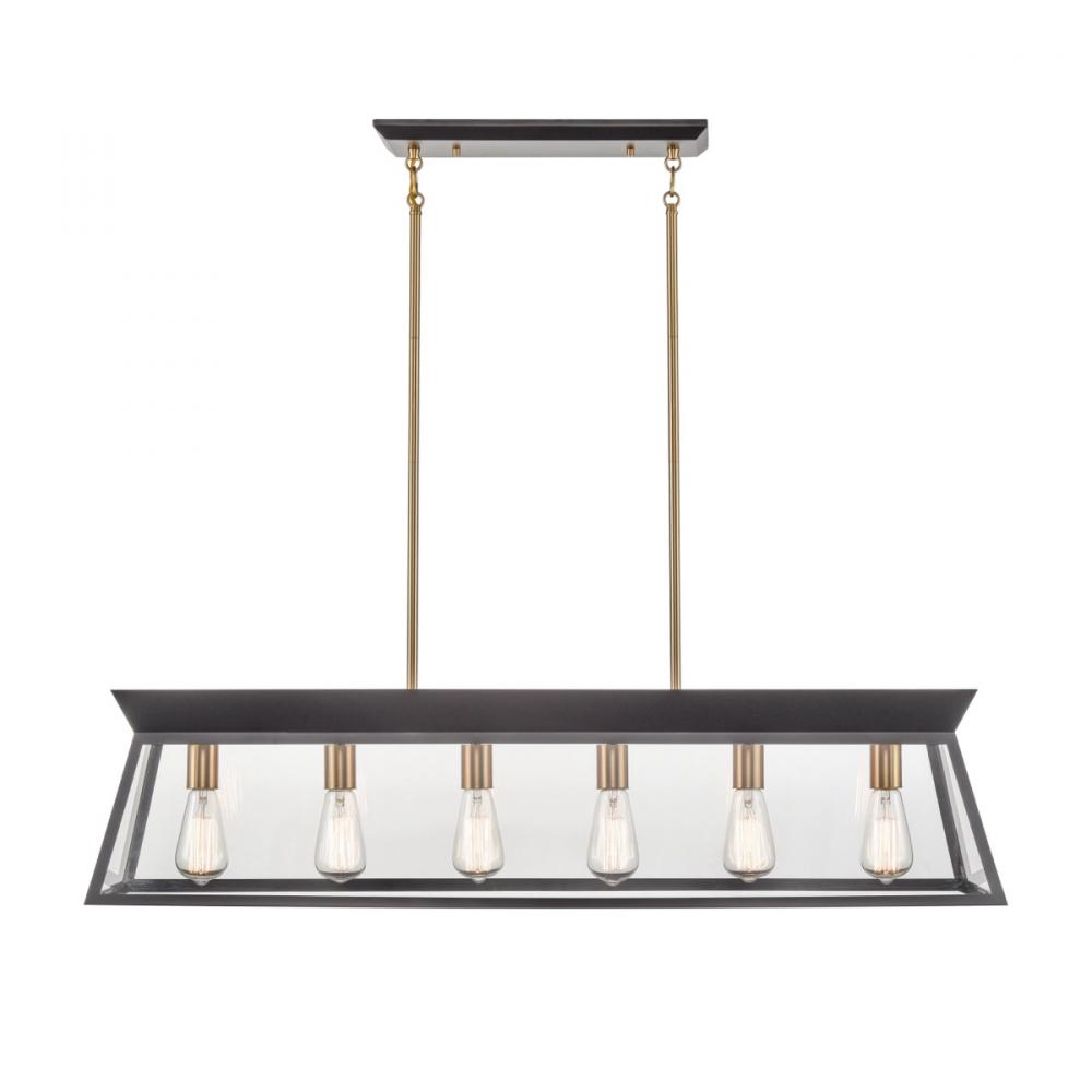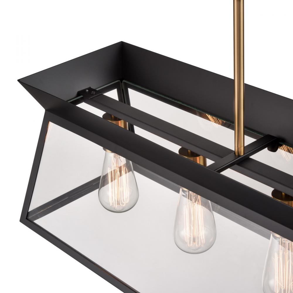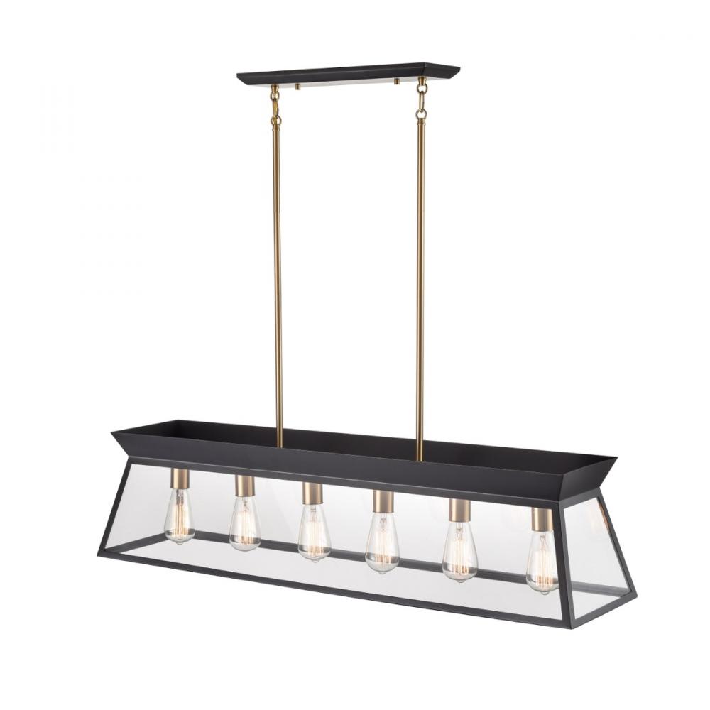 The Lucian collection, designed by Kevin Kraemer, is a modern twist on a classical lantern style light. Shown in black with brass accents (also available in a rich plated brushed brass). Clear panel glassware surrounding the bulbs. The model shown is a linear island chandelier which comes with extra rods for easy height adjustment and has a hangstraight to be compatible with sloped ceilings. Great for any table or island area.